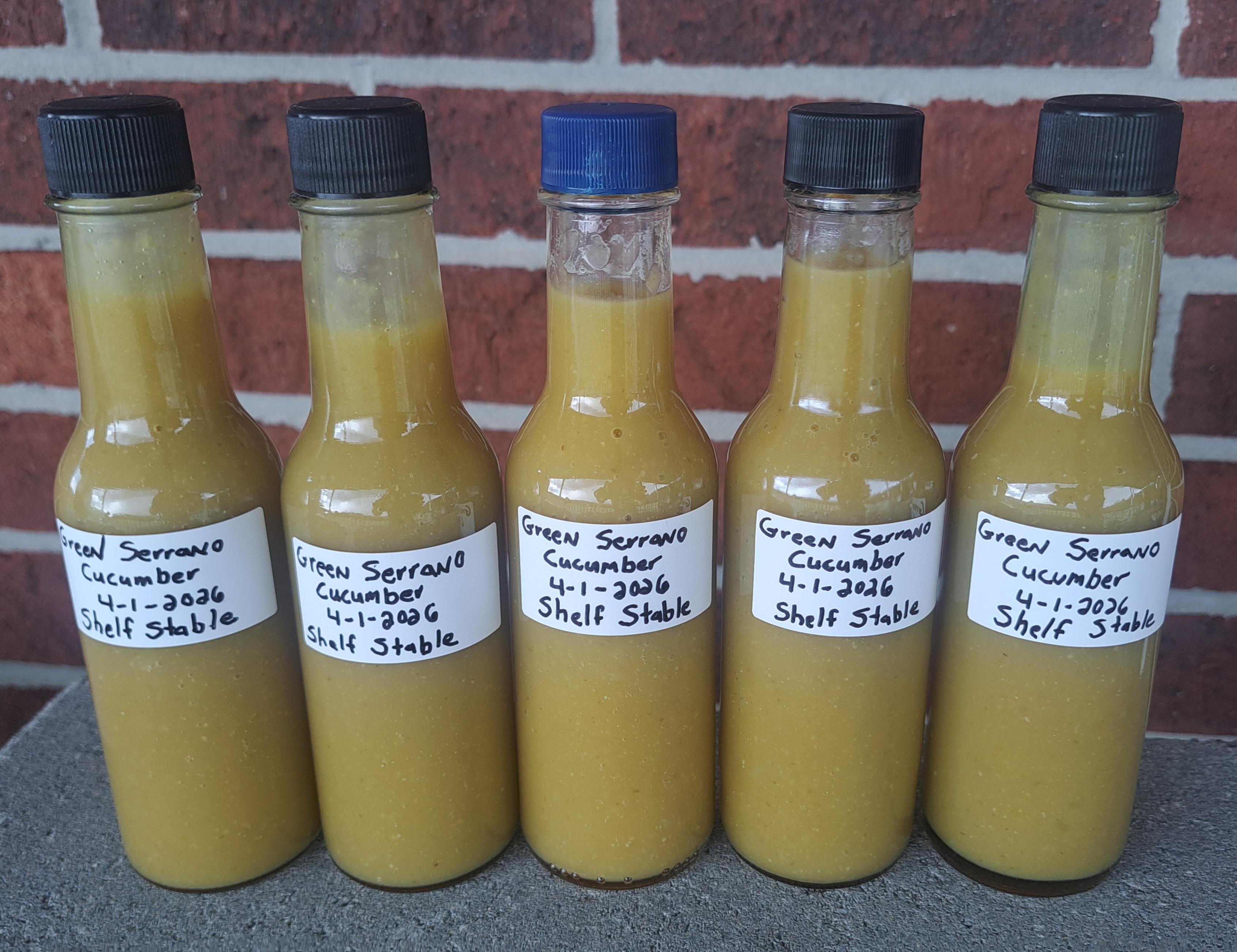 Made this batch of Green Serrano Cucumber hot sauce, and this one is probably the most favored sauce that I have given to my fellow pepperheads that I work with. Similar to Yellowbird, but this one has a stronger Cucumber taste and is actually hot!