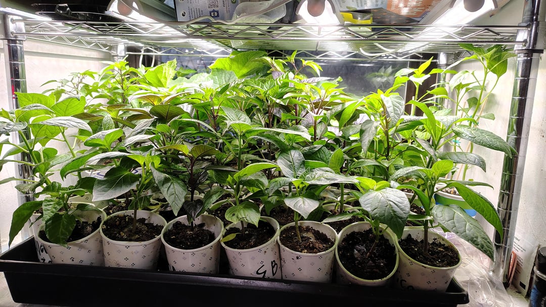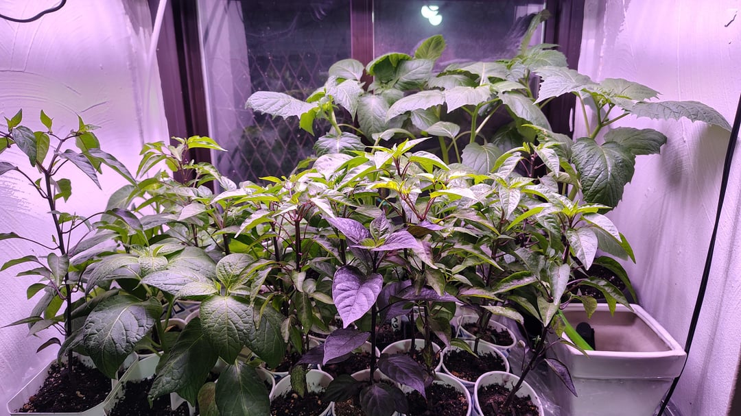 Non-pepper plants are purple tomatillos, winter melon, and some mint and arugula I should put outside soon.