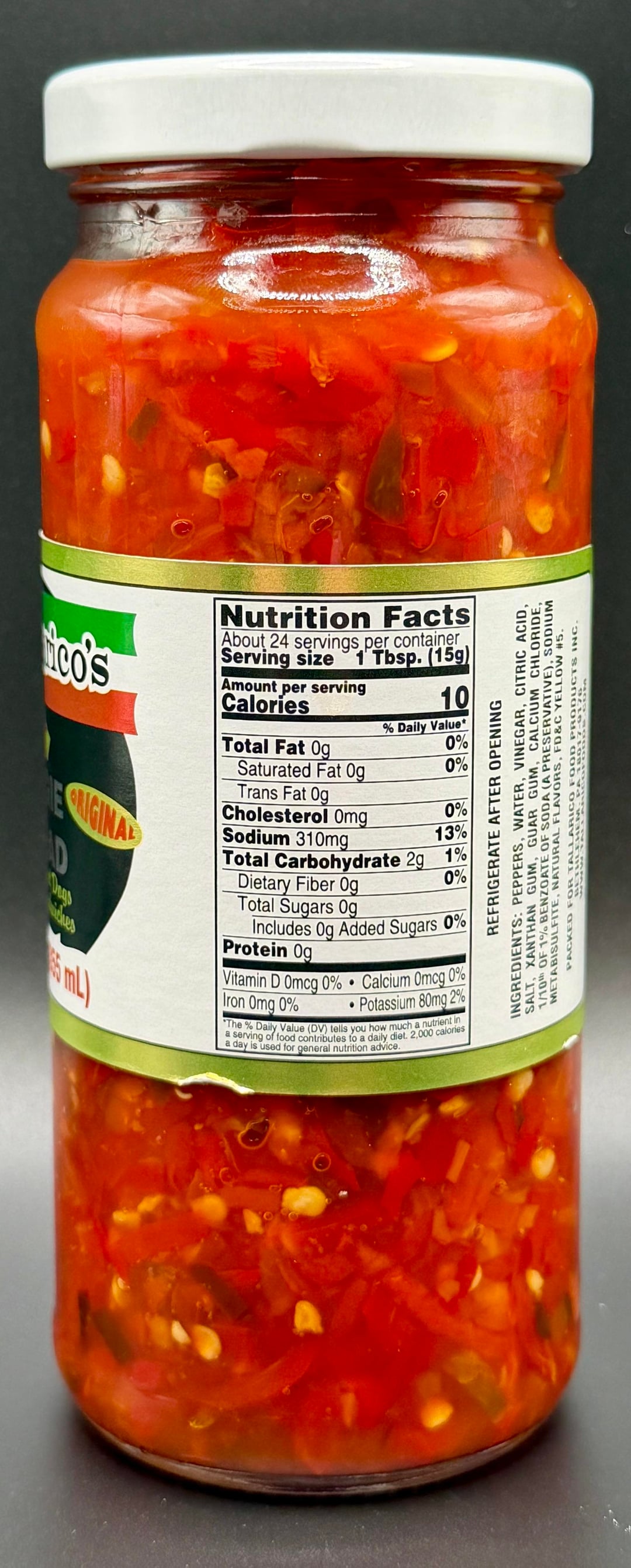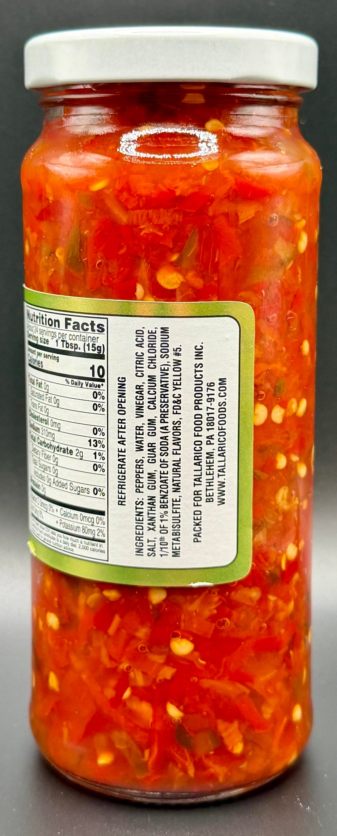 Ingredients: Peppers, Water, Vinegar, Citric Acid, Salt, Xanthan Gum, Guar Gum, Calcium Chloride, 1/10th of 1% Benzoate of Soda (a preservative), Sodium Metabisulfite, Natural Flavors, FD&C Yellow #5