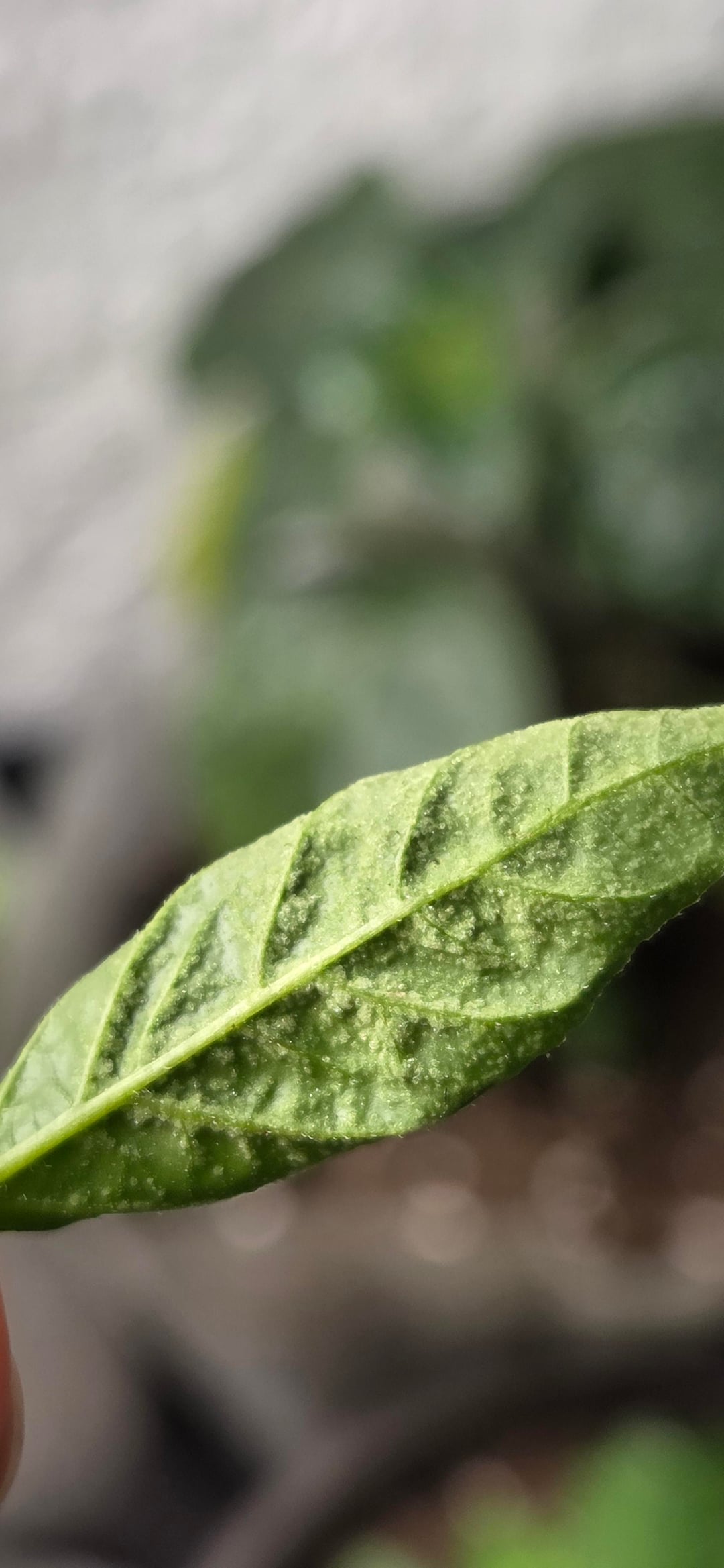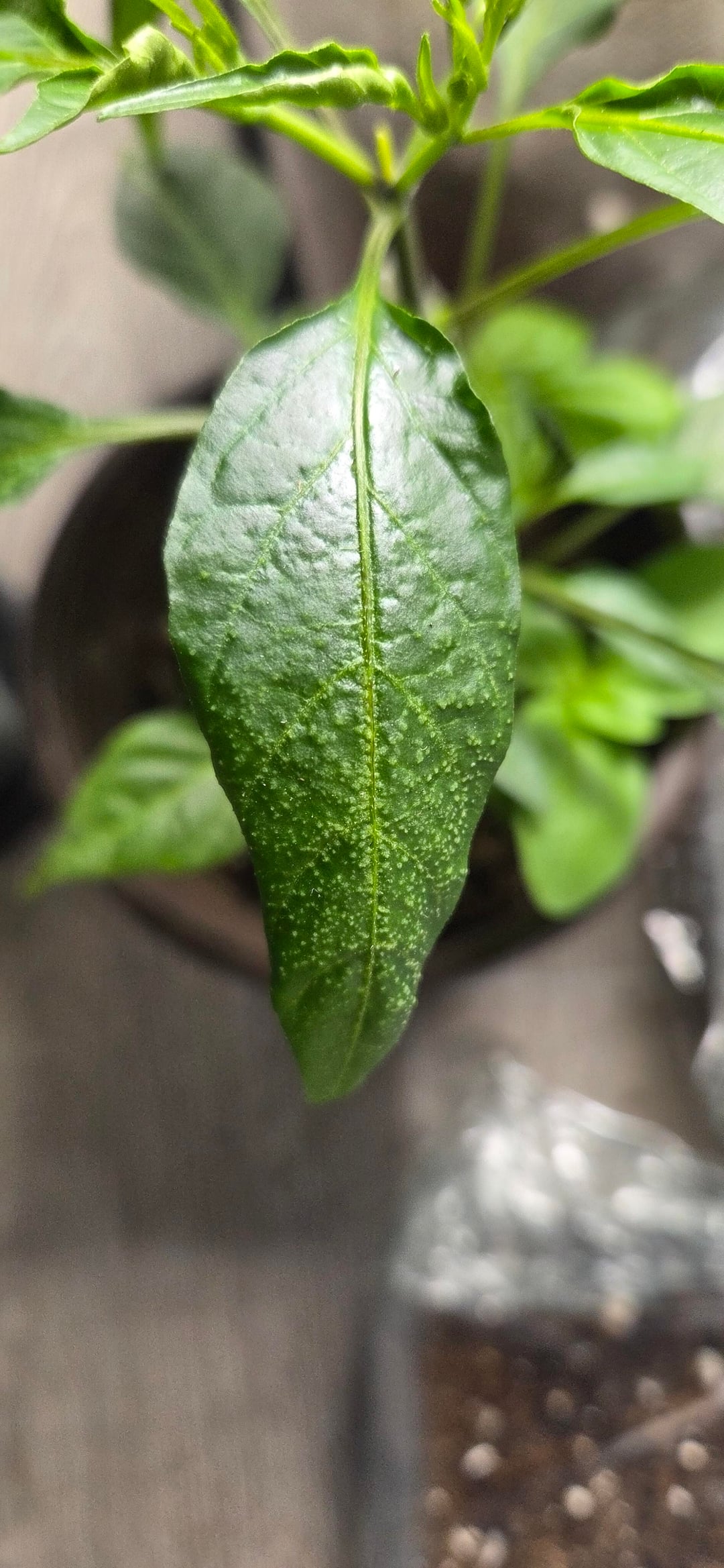 I've noticed some small, crystal-like spots on the leaves of my chili plant. They seem to be firmly attached and don't wipe off easily.