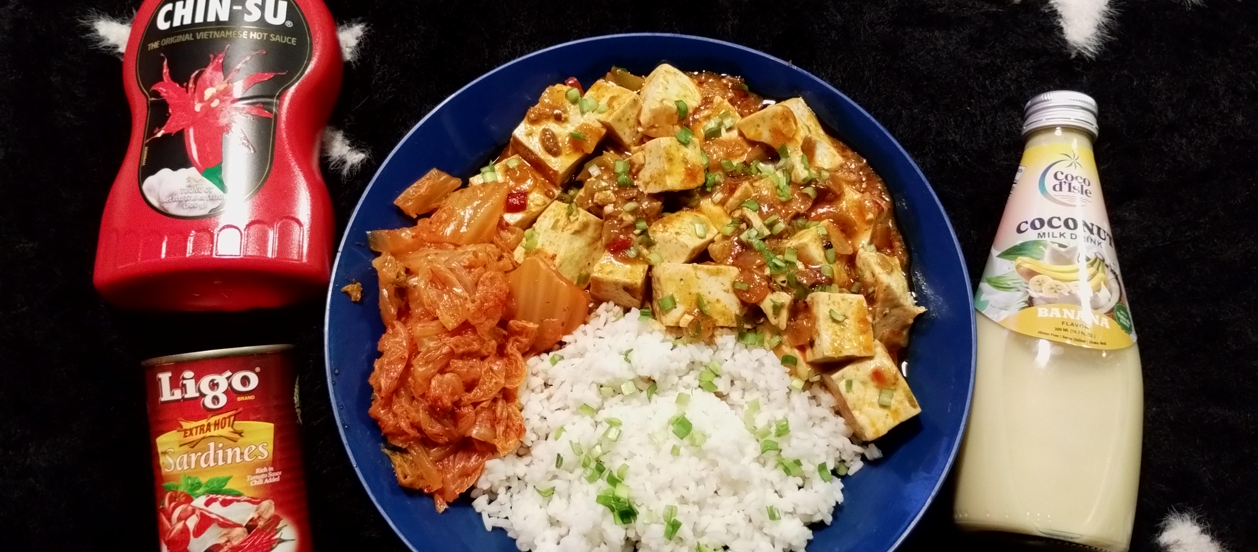 Got hungry, so whipped up this amazing and SPICY meal! Used a Szechuan Mapo sauce that was already the Extra Hot with one 19oz Medium Firm tofu cut into cubes, then added Thai chilies, and Chin-Su sauce. Paired it with simple rice, my homemade kimchi, and a can of Ligo Extra Hot Sardines, then sprinkled on some Asian chives and a bit more Chin-Su. Freaking Delish!!