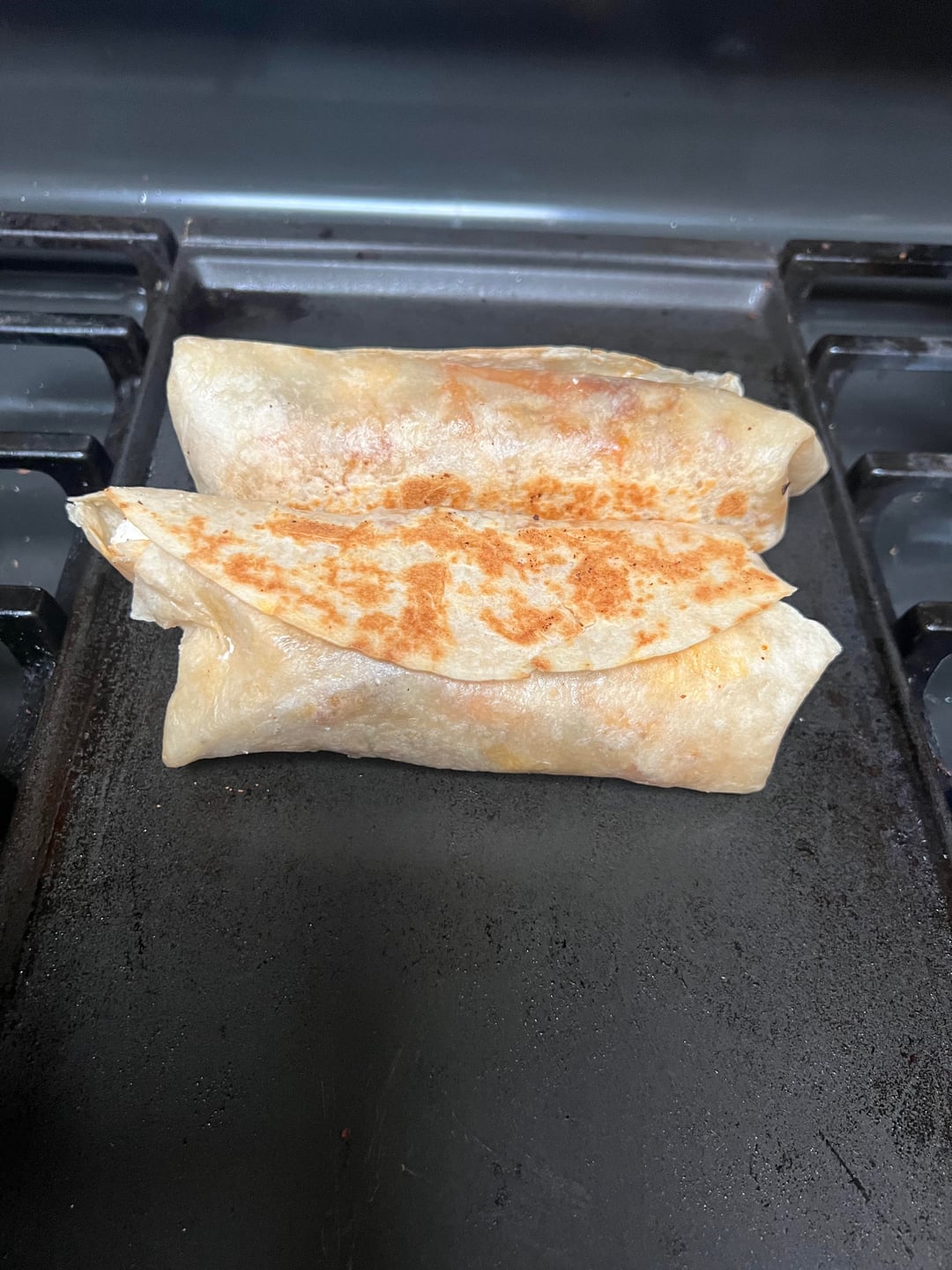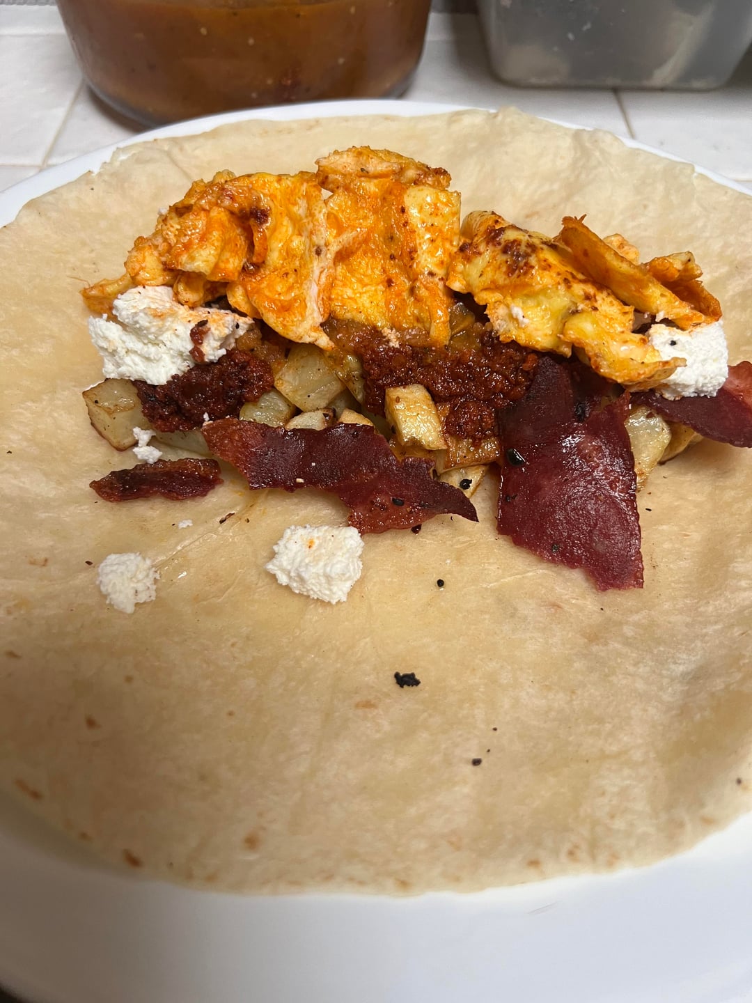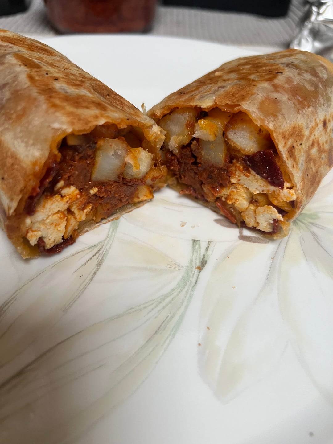 Burrito de desayuno con papas y chorizo, tocino de pavo y huevos y salsa roja y queso fresco.