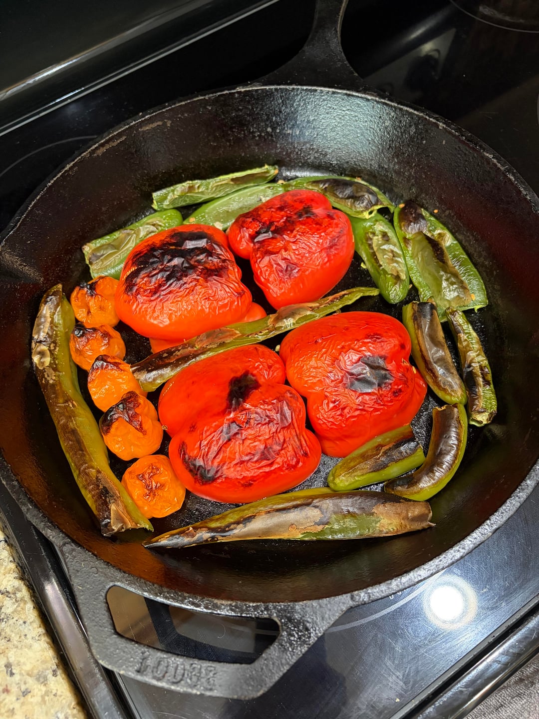 Place all peppers in a 15-inch cast iron skillet with peppers skin side up