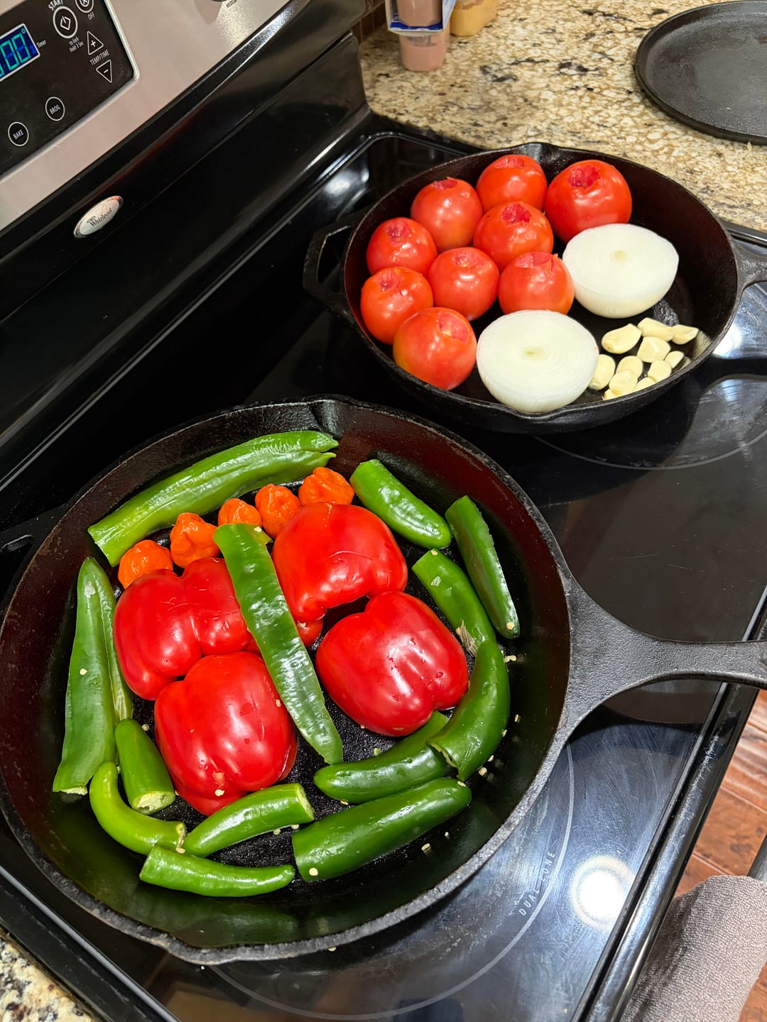 Vapesuvius 2 hours ago #FIRE-ROASTED SALSA ROJA##INGREDIENTS * 9 vine-ripened tomatoes * 1 large white onion 5 habanero peppers * 4 serrano peppers 3 jalapeños * 2 red bell peppers * 1 Anaheim pepper * 60 ml lime juice * 1 tablespoon kosher salt * Cilantro to taste * Garlic to taste#METHOD1. Preheat broilerTurn broiler on to preheat2. Prepare vegetablesWash all vegetablesRemove tomato stem endsFor all peppers except serranos, remove tops, halve, and remove seeds and membranes3. Arrange for roastingPlace tomatoes, onion, and garlic in a 12-inch cast iron skillet with tomatoes stem side upPlace all peppers in a 15-inch cast iron skillet with peppers skin side up4. BroilBroil peppers for 15 minutesBroil tomatoes and onion for 30 minutes or until blackened on top5. First blendAdd lime juice, salt, cilantro, and peppers to food processorBlend until fully liquefied and emulsifiedPour into a large metal bowl6. Second blendAdd 2 largest tomatoes, half the onion, and garlic to food processorBlend until fully liquefied and emulsifiedPour into the same metal bowl7. Third blendAdd remaining half onion to food processorPulse until dicedAdd to the metal bowl8. Texture blendAdd remaining 7 tomatoes to food processorPulse until slightly chunkyAdd to the metal bowl9. FinishLightly whisk everything together