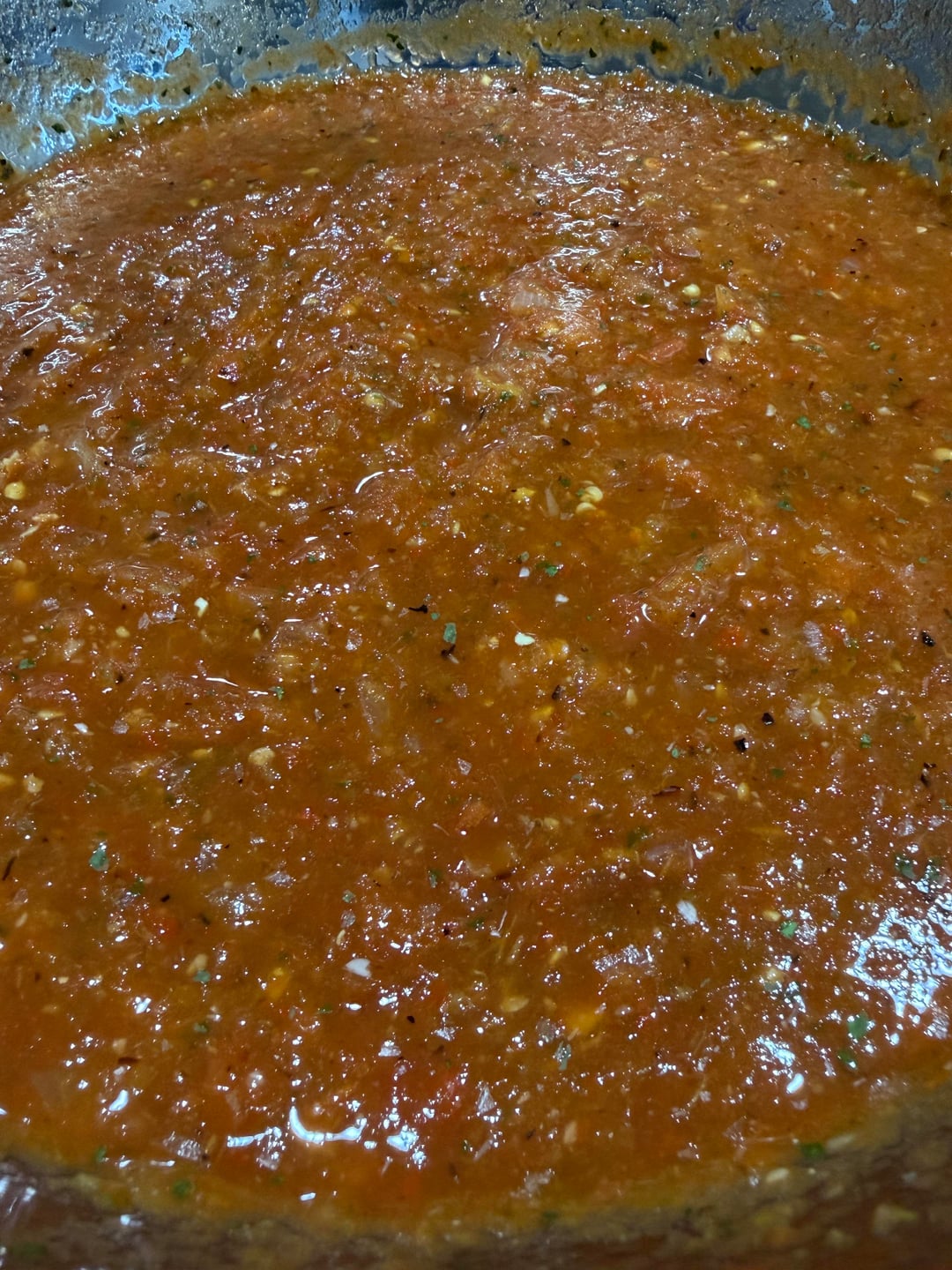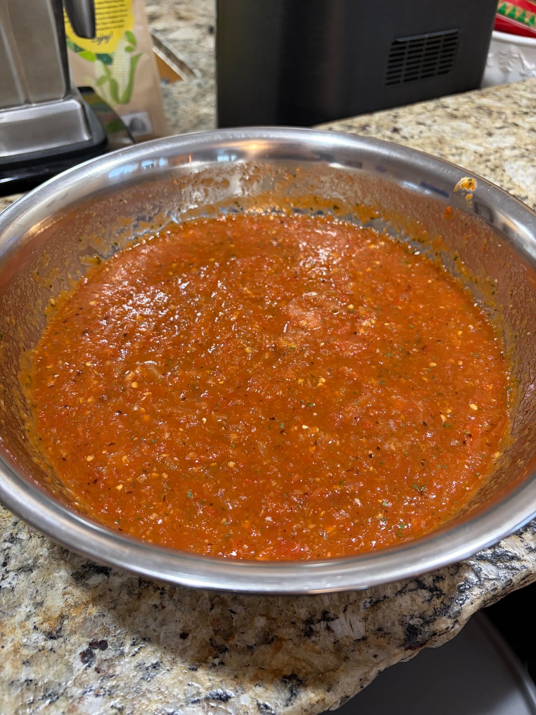 Made myself a birthday salsa by Vapesuvius pico de gallosalsaSauce 3 Comments Vapesuvius 2 hours ago #FIRE-ROASTED SALSA ROJA##INGREDIENTS * 9 vine-ripened tomatoes * 1 large white onion 5 habanero peppers * 4 serrano peppers 3 jalapeños * 2 red bell peppers * 1 Anaheim pepper * 60 ml lime juice * 1 tablespoon kosher salt * Cilantro to taste * Garlic to taste#METHOD1. Preheat broilerTurn broiler on to preheat2. Prepare vegetablesWash all vegetablesRemove tomato stem endsFor all peppers except serranos, remove tops, halve, and remove seeds and membranes3. Arrange for roastingPlace tomatoes, onion, and garlic in a 12-inch cast iron skillet with tomatoes stem side upPlace all peppers in a 15-inch cast iron skillet with peppers skin side up4. BroilBroil peppers for 15 minutesBroil tomatoes and onion for 30 minutes or until blackened on top5. First blendAdd lime juice, salt, cilantro, and peppers to food processorBlend until fully liquefied and emulsifiedPour into a large metal bowl6. Second blendAdd 2 largest tomatoes, half the onion, and garlic to food processorBlend until fully liquefied and emulsifiedPour into the same metal bowl7. Third blendAdd remaining half onion to food processorPulse until dicedAdd to the metal bowl8. Texture blendAdd remaining 7 tomatoes to food processorPulse until slightly chunkyAdd to the metal bowl9. FinishLightly whisk everything together gib12 2 hours ago Happy birthday! Your salsa looks delicious. It would not make it through the day at my house. 😂 I_Weep_for_Willow 2 hours ago Looks great. Feliz cumpleaños: )Write A CommentYou must be logged in to post a comment.
