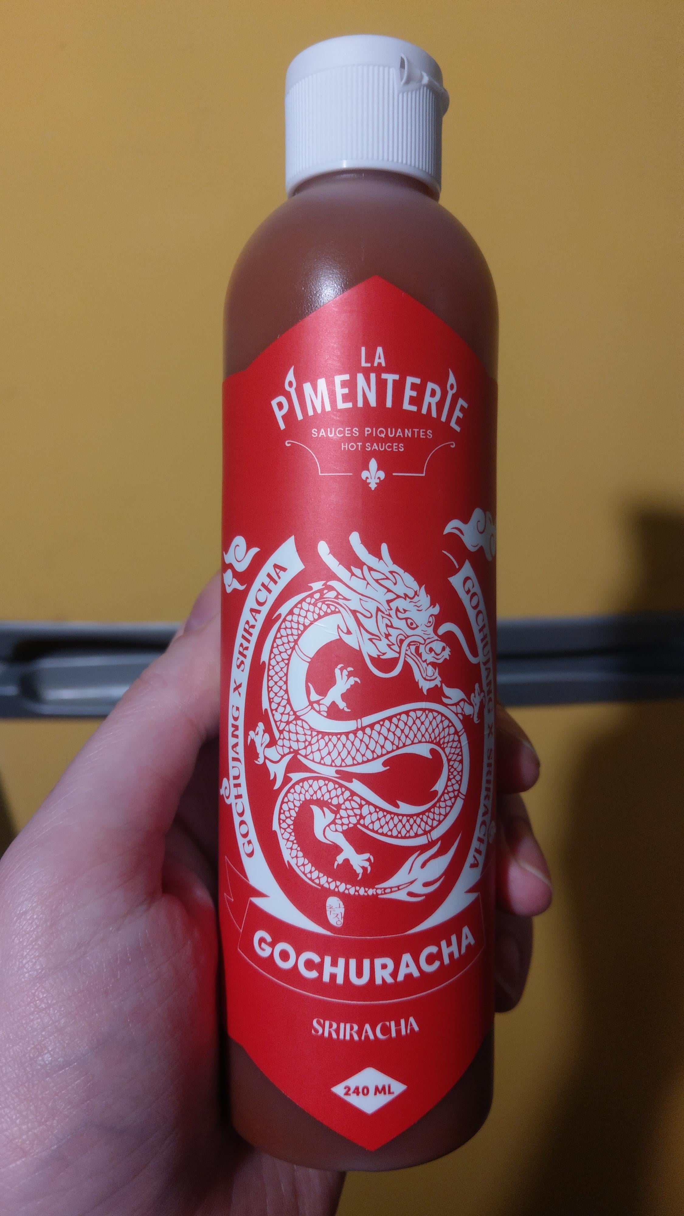 Had some leftover rice so I decided to make some fried rice today. Decided it was the perfect opportunity to open the La Pimenterie Gochuracha I got. It's supposed to be a mix between Gochujang paste & Sriracha. I still got an open bottle of the classic Sriracha with the green lid and that's the standard I compare it to. Flavorwise it's definitely more on the Gochujang side and I like that. You can get a decent fermented taste. Very sweet, slightly sour, not a lot of heat. I'd say it's milder than the OG Sriracha. Wouldn't bother me too much, cause I can easily change that, but I'm really missing the garlic flavor. It's a decent sauce, but I probably won't buy it again.