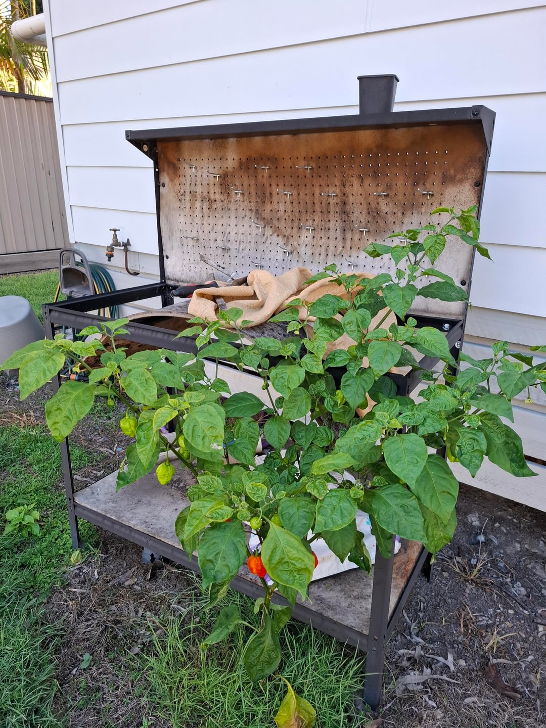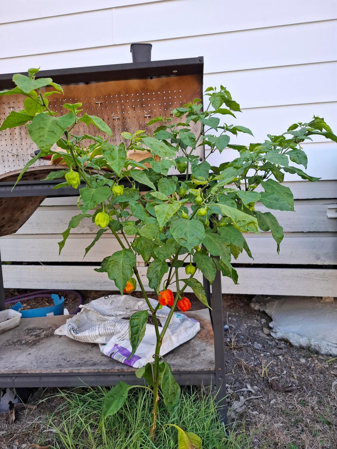 I picked some Trinidad scorpion peppers from my raised garden bed a while ago, I put them on my work table and completely forgot about them, hot and sunny for months so the wood warped and I guess they found there way onto the ground. i have been watering it due to the summer heat but no fertilizer or anything. I'm thinking about ditching the raised beds and just dropping pods on the lawn at this stage.