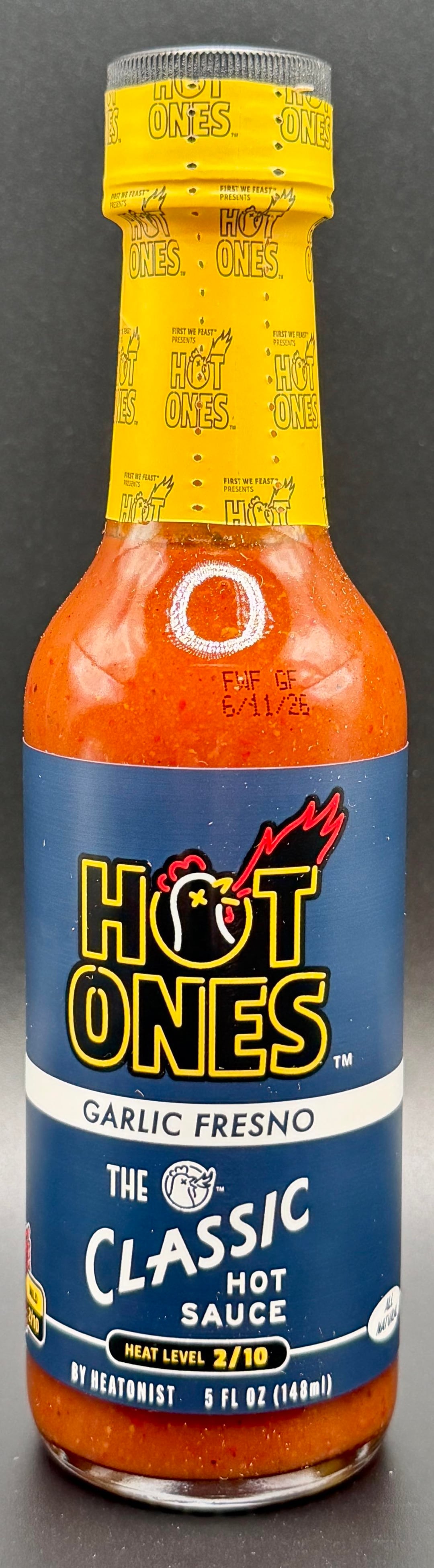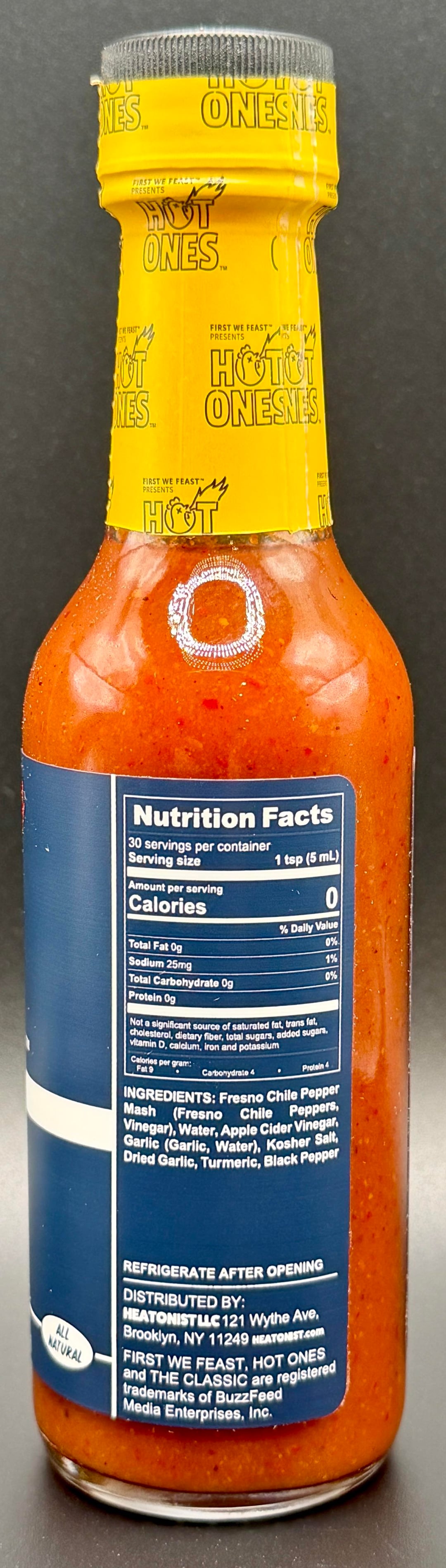 Hot Ones The Classic Fresno Garlic has a vinegar-forward flavor, but it’s not in the same way as a sauce like Tabasco or Louisiana. Instead, while this sauce is tangy, it’s also very tart. Apple cider vinegar has a certain tartness and sweetness that makes the flavor different from more neutral vinegars and its a dominant flavor in this sauce. The Fresnos do stand up to it though and there’s a nice fruity earthy and slightly smoky flavor from the chiles. The turmeric enhances that earthiness. As I mentioned looking at the ingredients the garlic content doesn’t seem to live up to what the label blurb hypes. While there is a garlic flavor to this sauce it’s not a major “smack you in the face” level of garlic but rather a supporting character to the Fresno chile and apple cider vinegar. In my review of The Classic Chili Maple I mentioned that the sauce had a weak flavor that felt a little watered down, thankfully that isn’t an issue with this one. While it’s not nearly as intense as some of the very thick sauces from Puckerbutt it still has solid flavor, and has a great balance between fruity, earthy, garlicky, sour, and tart. The heat level is low with no burn. Fresno chiles aren’t very hot to begin with and this sauce is on the thinner side the chile content is even more diluted.