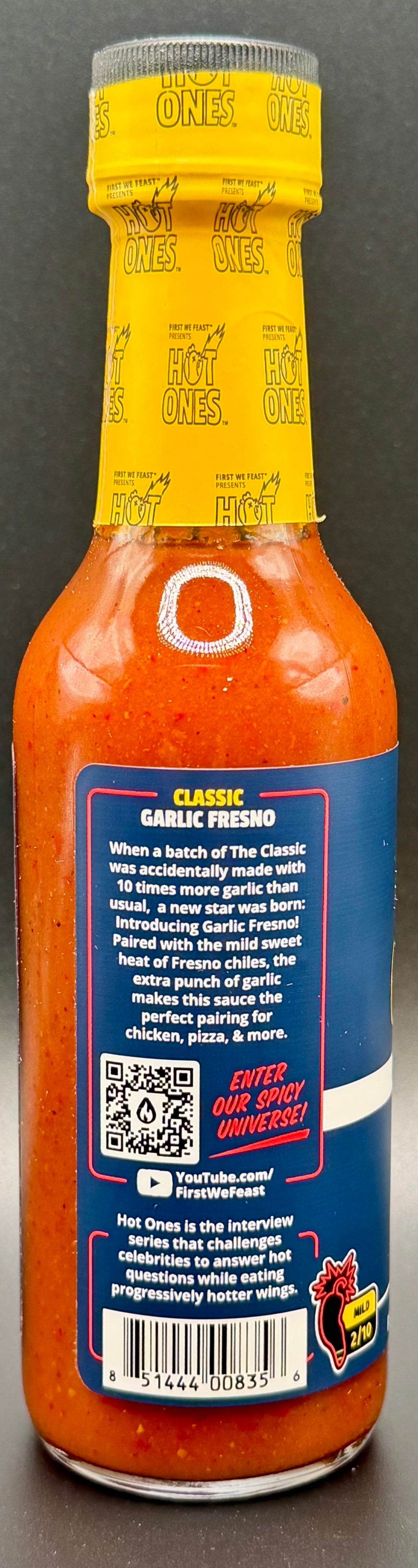 This is the third of the Hot Ones The Classic hot sauces I’ve tried after already enjoying their The Classic Original and The Classic Chili Maple. This particular sauce has landed in the number one position on The Hot Ones show in seasons twelve, thirteen, sixteen, eighteen, and twenty-four. Interestingly the blurb on the back of the bottle says that this sauce came about through an accidental mixture of ten times more garlic than planned into a batch of The Classic. While it doesn’t mention which Classic they refer to I’d have to assume they’d be the original, however The Classic Original is a chile de arbol based sauce though The Classic Chili Maple is based on fresno peppers. Regardless, I do love Fresno chiles and I love garlic so I was happy to give this one a go.