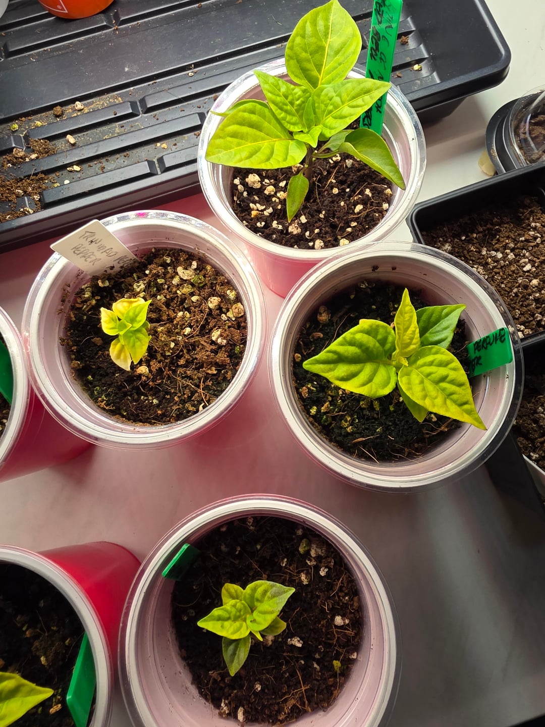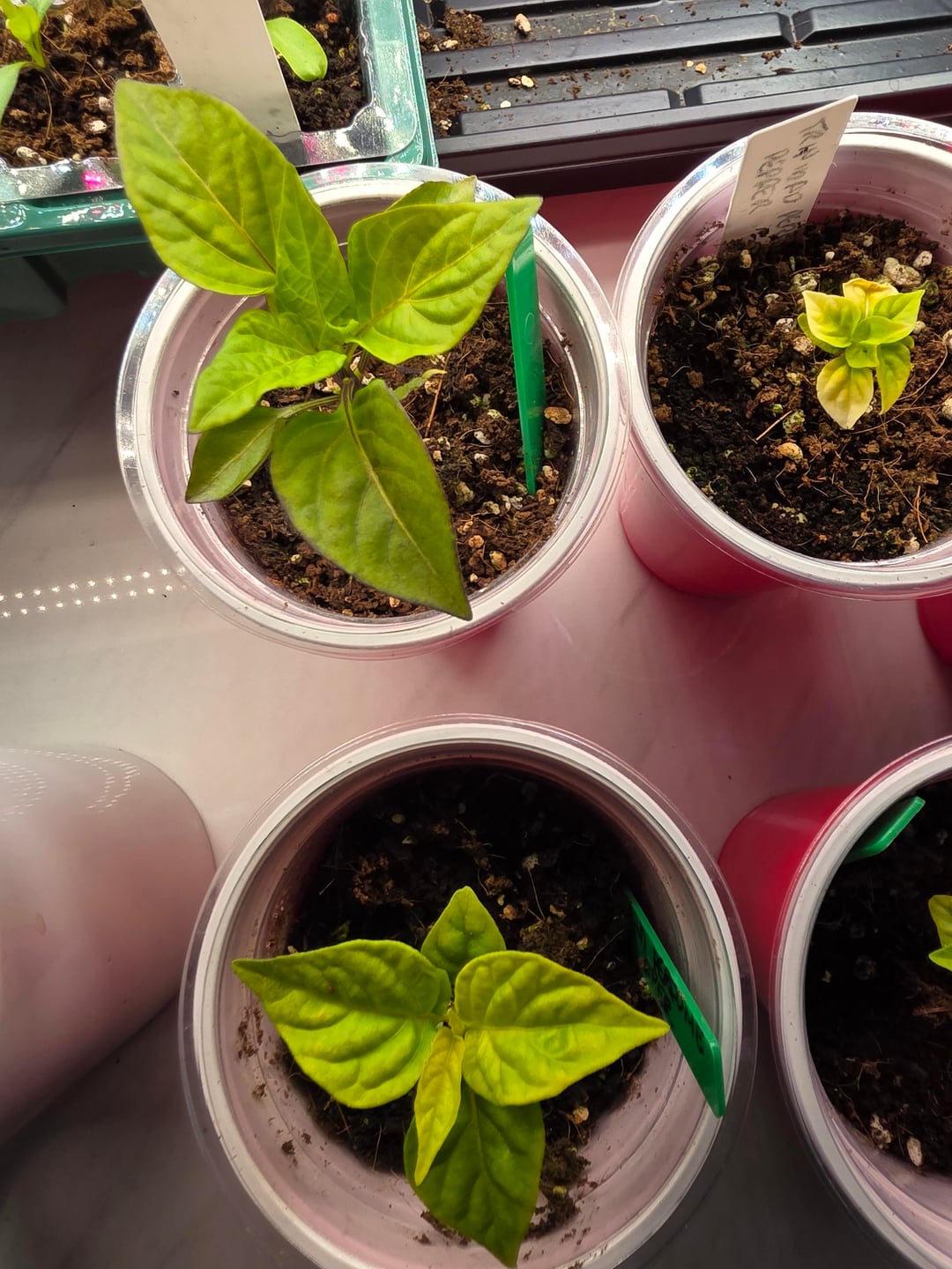Only one appears to lack some nitrogen and I spritzed some diluted fertilizer on the leaves to help it out. It seemed to helped. The new leaf growth is green. This fella is my newborn pepper (others been around since end of February).