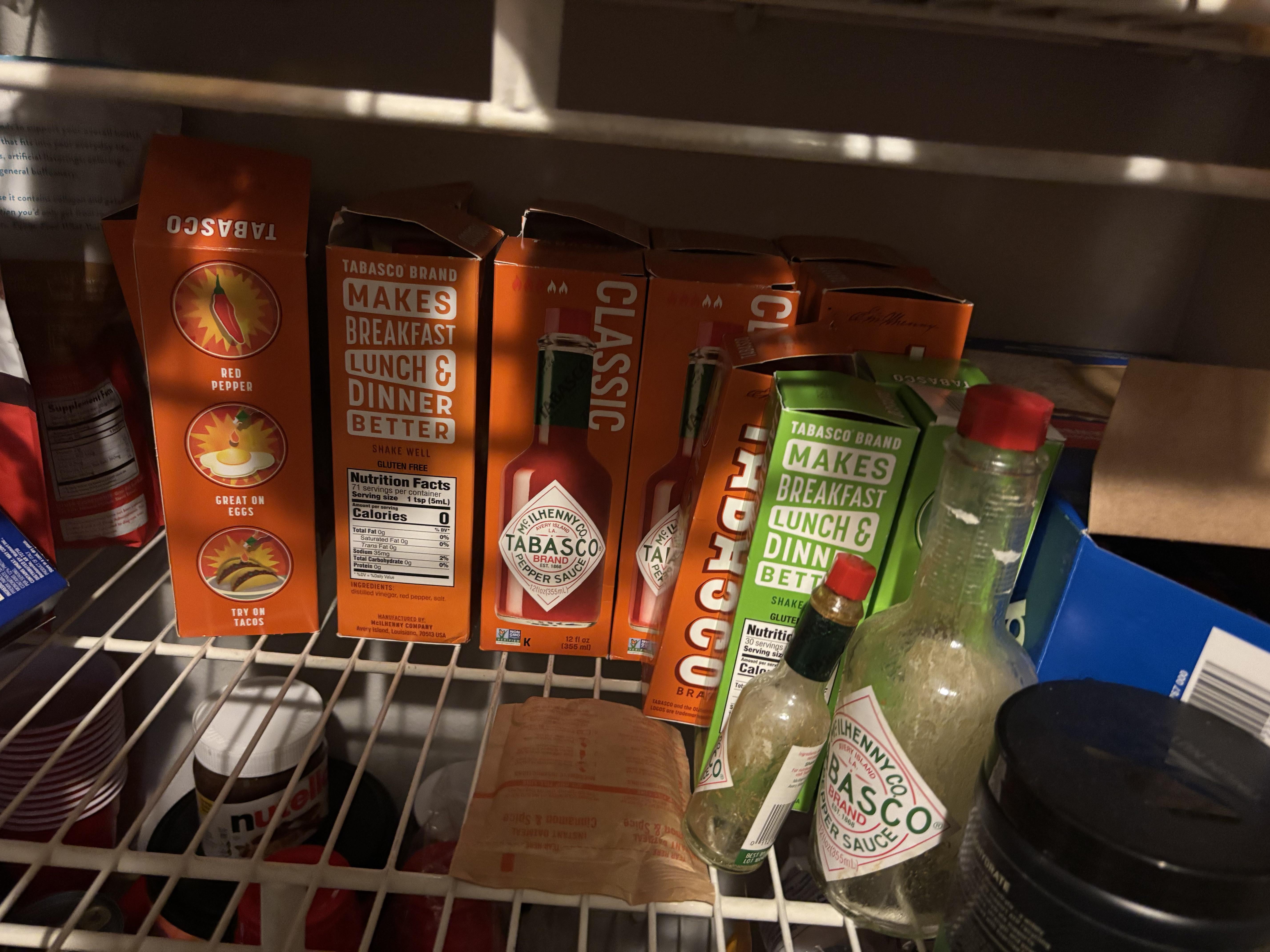 M(21) ive been obsessed with hot sauce but particularly tabasco since i was a child. I would finish probably a 12fl oz by myself a month. I didnt start collecting my bottles till i moved out which is about 12 bottles worth by now with smaller ones included. Anyone else keep there empty bottles?