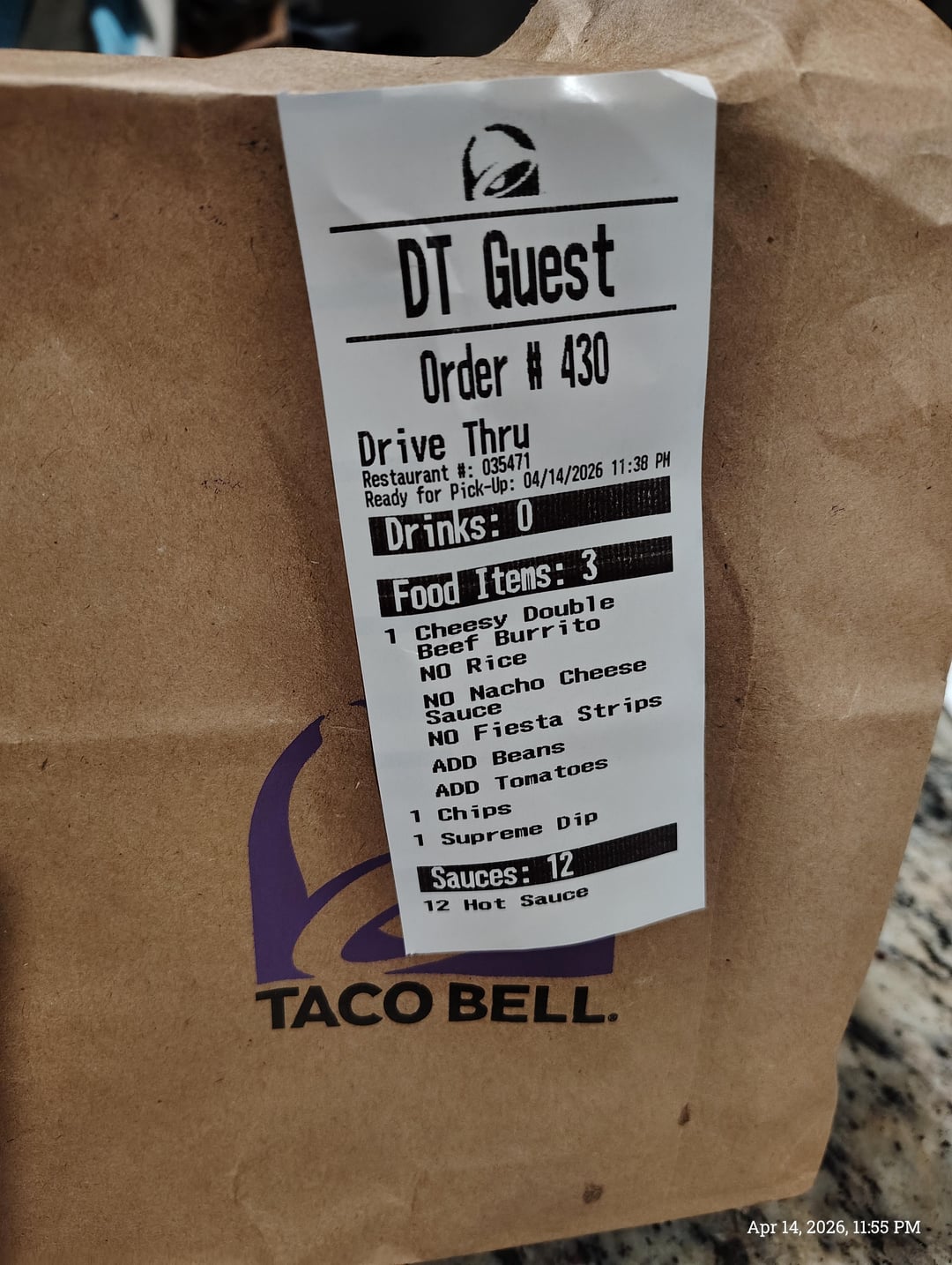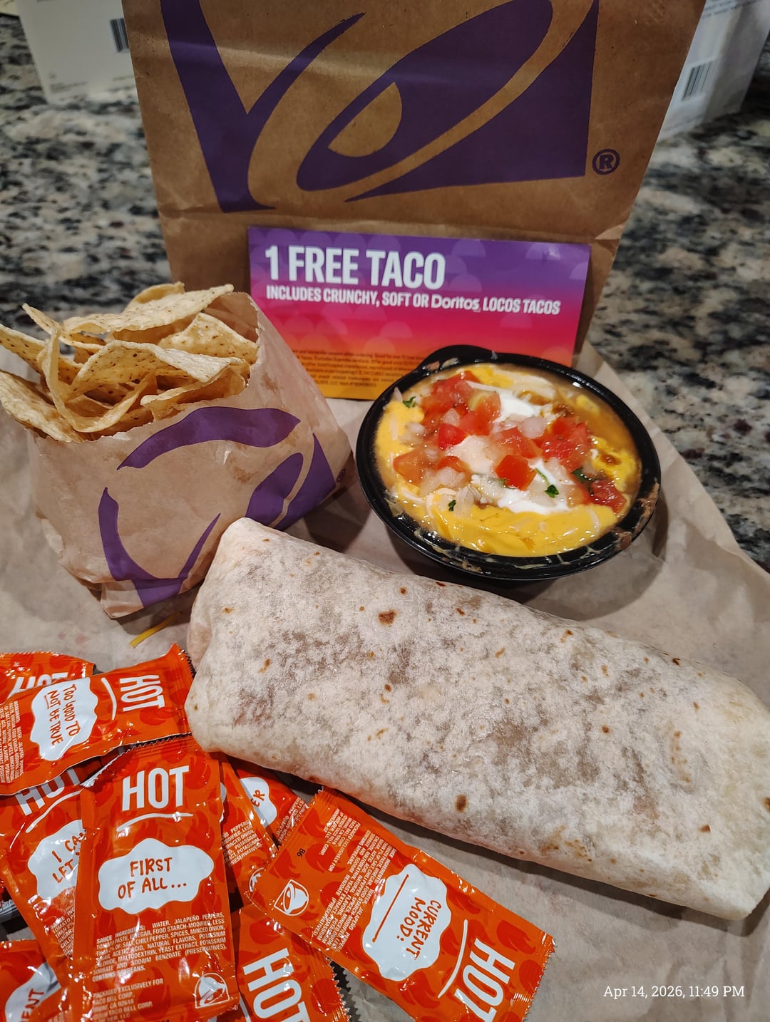 Customized a Burrito Supreme for $4.59, and added value Nachos Supreme…total came to about $7.50. Cravings satisfied👅My guy at the window hooked me up with a FREE Taco voucher 🙃🌮