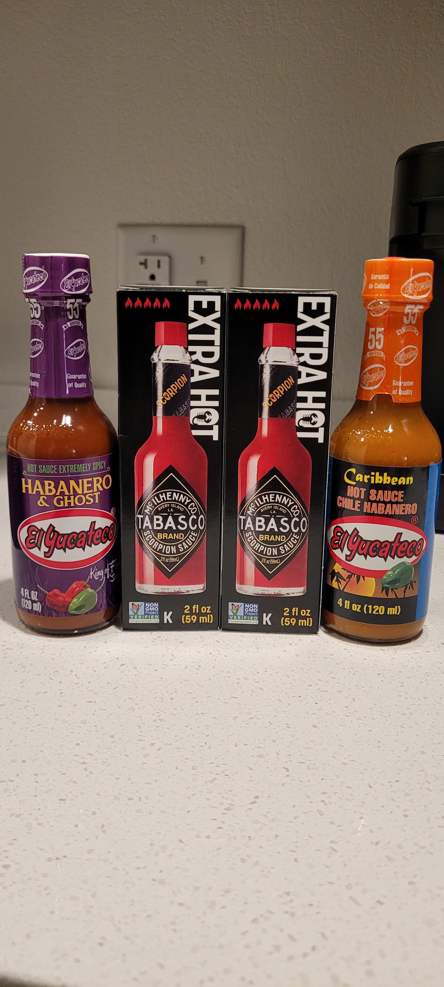 I've only ever heard good things about the scorpion Tabasco, so I grabbed two. Never tried it before! Also new to these specific El Yucateco, but the xxx habanero is always in rotation.