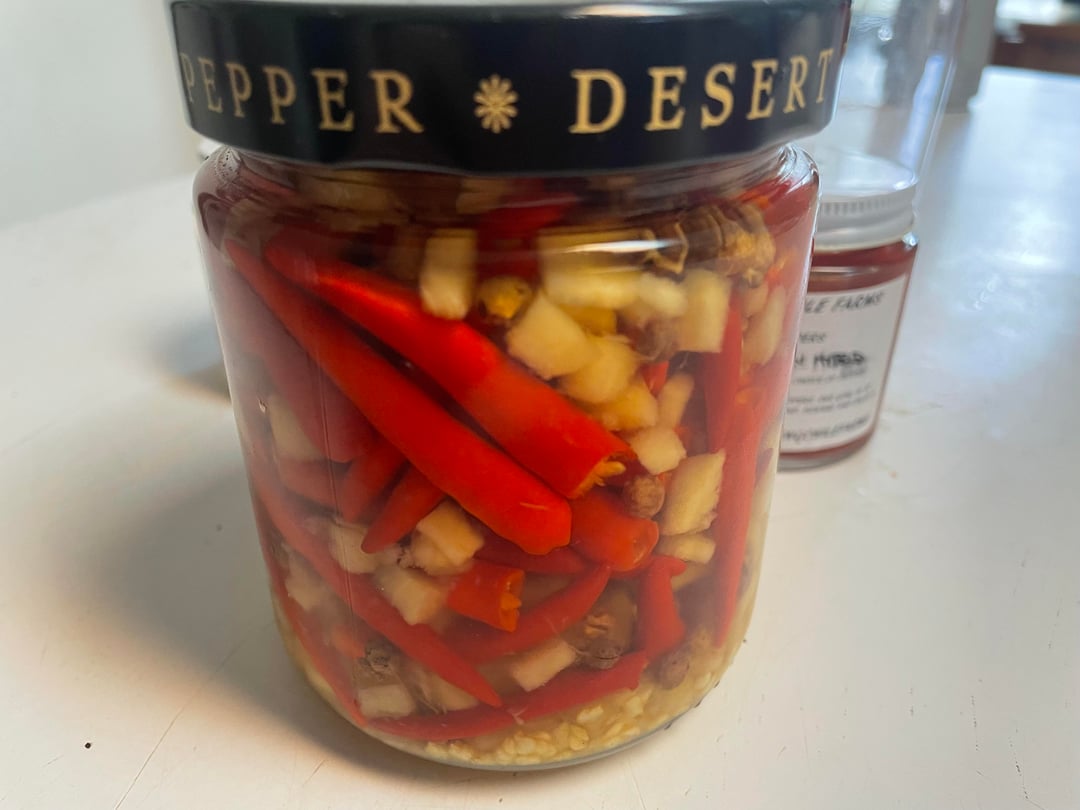 I made this incredible hot sauce with fermented ginger, Thai chilis, and Szechuan peppercorns. Not spicy enough for my ridiculous heat tolerance so I added 6 super hots as shown in the 2nd picture. It cost me about $5 per bottle to make this and I made enough for 4 bottles.