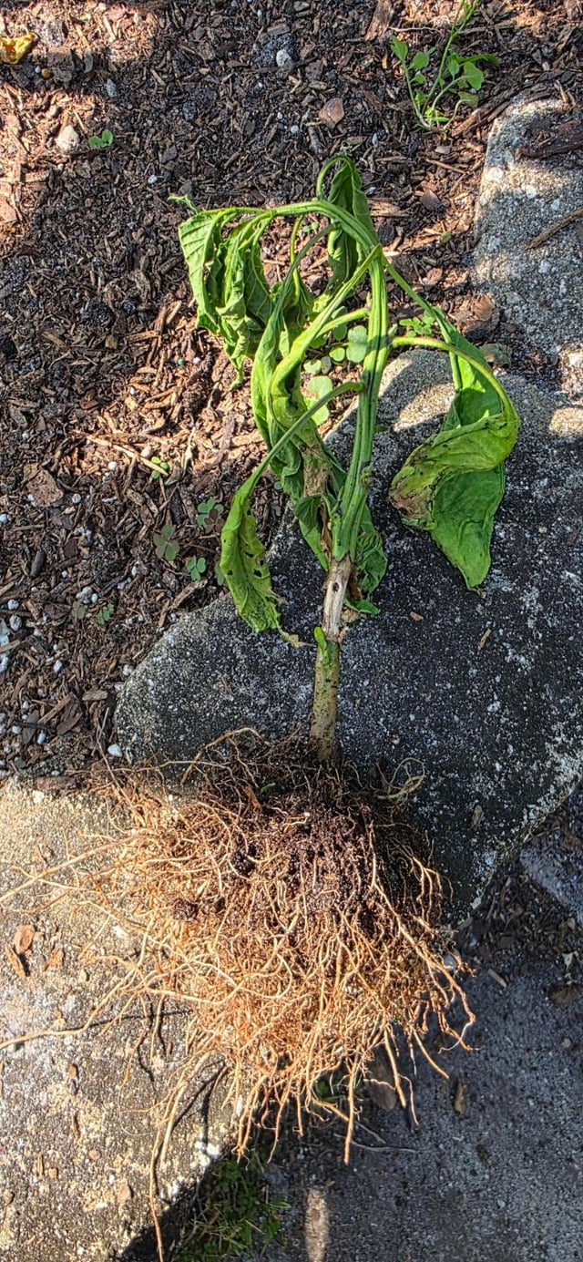 A few weeks ago I posted the first two images wondering what would cause my Ghost pepper plant to wilt during the day and come back at night. Found no definite answers and as expected the plant finally died. The third pic shows what looks like the stem was eaten all the way around. I have evidence that snails were present but thought they only eat the leaves. My garden has several other Ghosts (seen in the pics) and other peppers that are doing fine as well as tomatoes and herbs. I have replaced the plant from a backup seedling but would really love to know what this was.