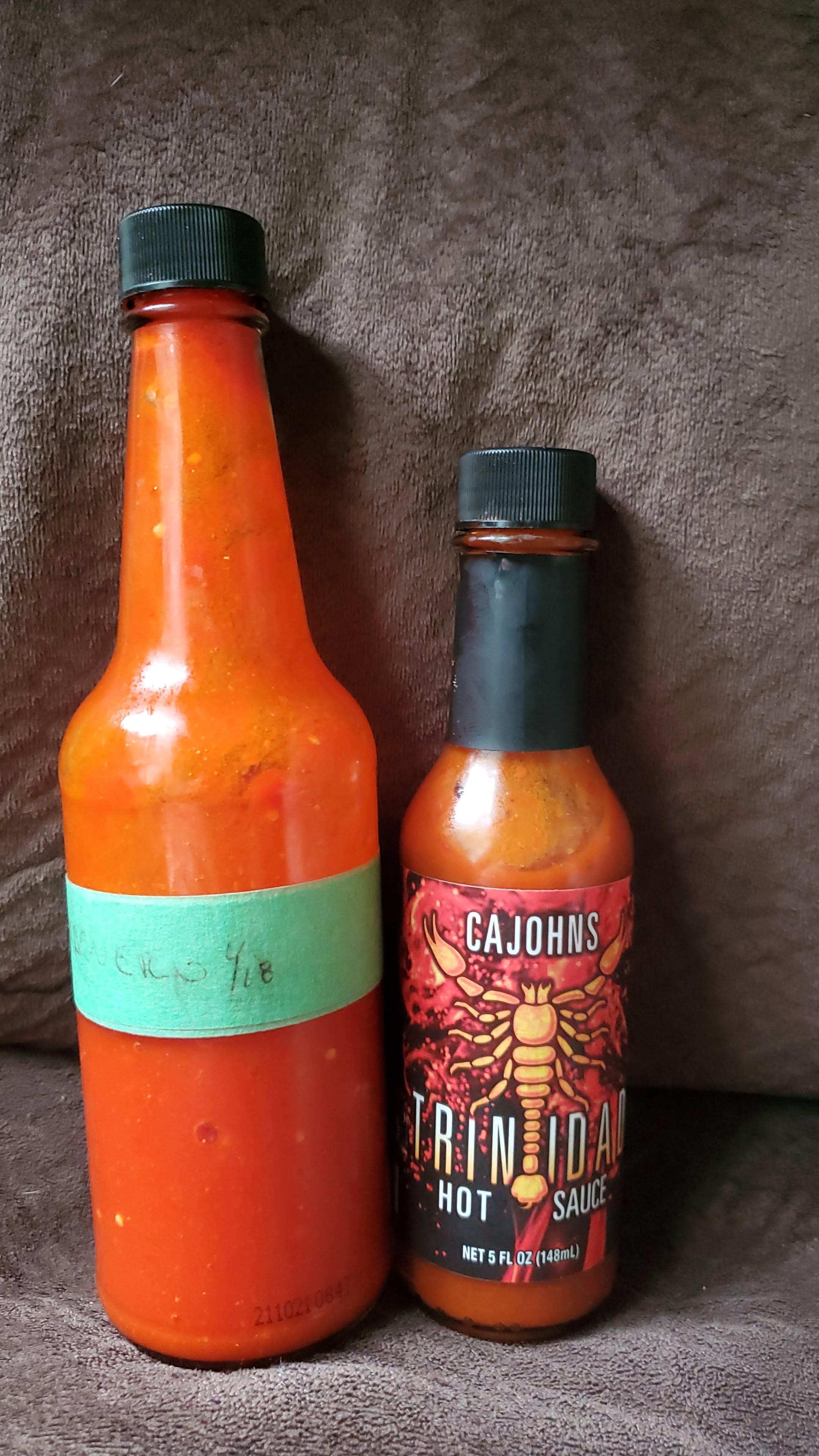 Getting low on the habanero hot sauce I made last year (fermented habaneros emulsified added equal in volume brine and vinegar for finished hot sauce) I bought cajohns trinidad. I expected the heat to be more than what I made but don't think it is. Not a bad hot sauce but I do want something hotter (trying to increase my tolerance.) Anyone had said hot sauce and know of one hotter thats easy to find?