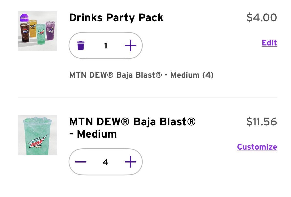 The fact that Taco Bell sells individual medium sized drinks at ~4 dollars a piece, when you can quite literally get FOUR medium drinks for the price of one is quite amusing to me. I imagine a family of four getting duped into ordering four individual drinks when they could’ve just gone for the party pack.