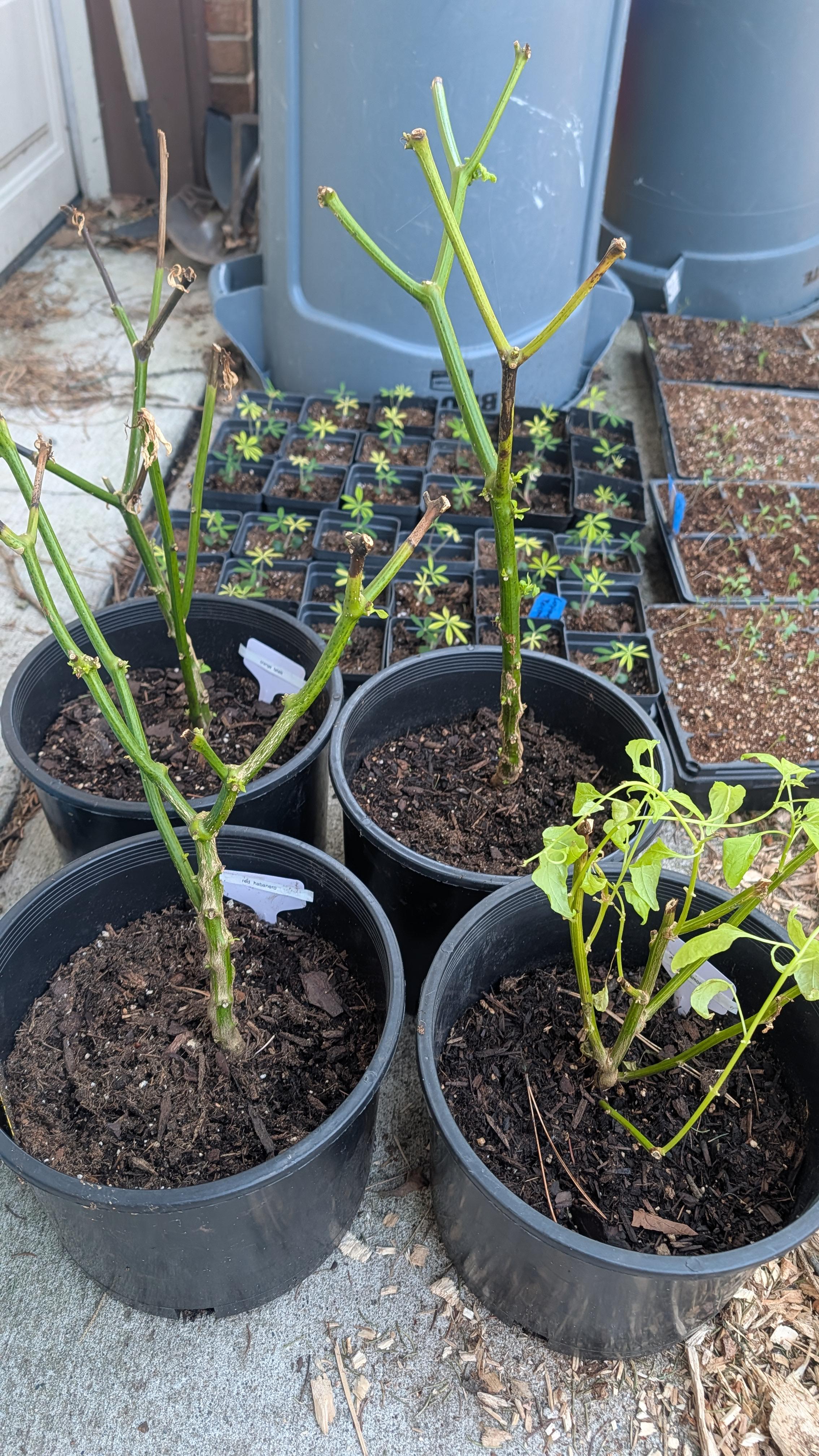 They're getting hardened off again, then I'll repot them in 7g bags. Are the dark stem ends dead, and should I trim them?
