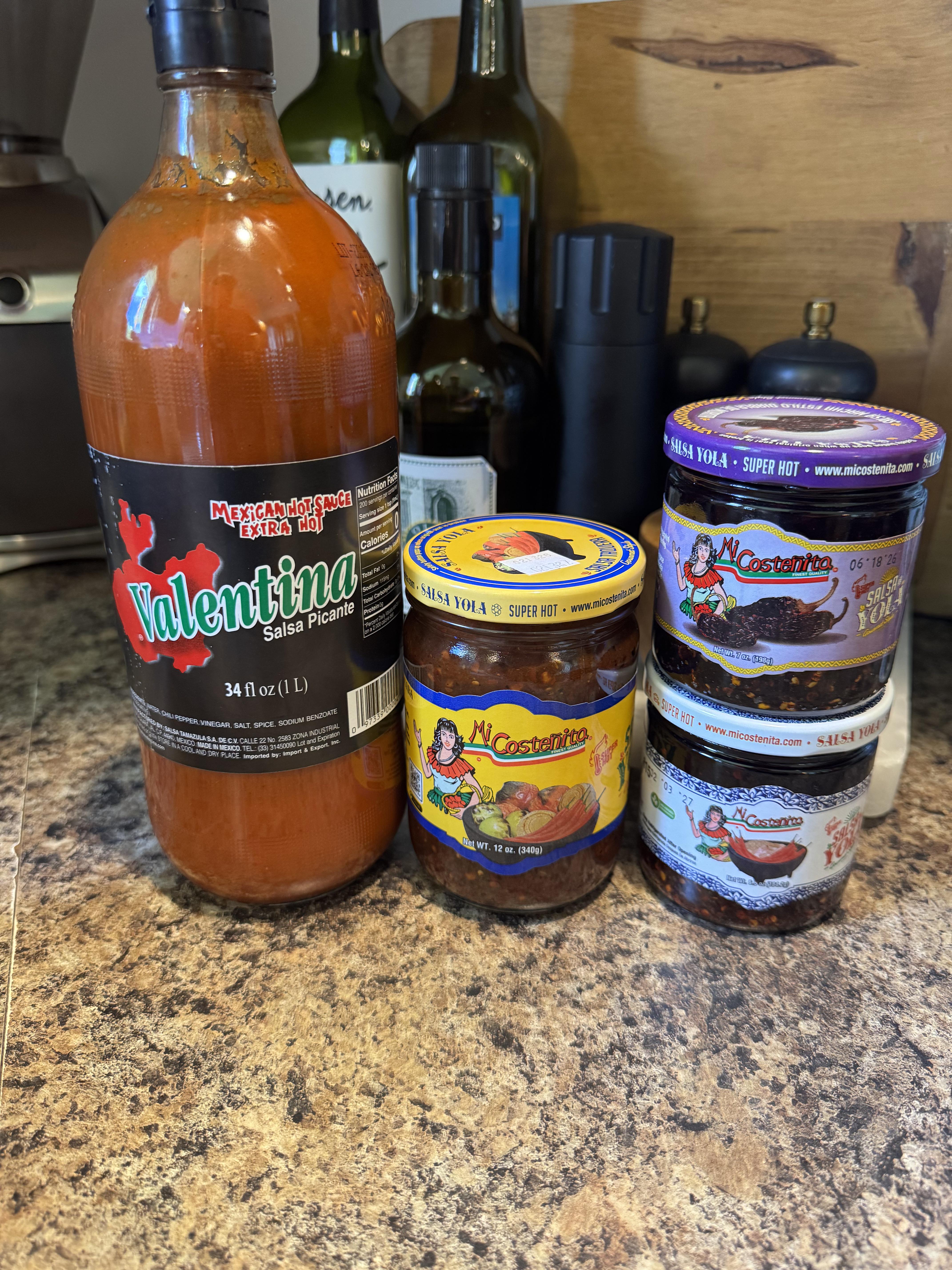 Nabbed a liter of Valentina Xtra hot for ~$3.00. The others are Mi Costenita Salsa Yola varieties. Big yellow jar of salsa Taquera, salsa Macha Estilo Diabla Morita, Salsa Macha Estilo Diabla