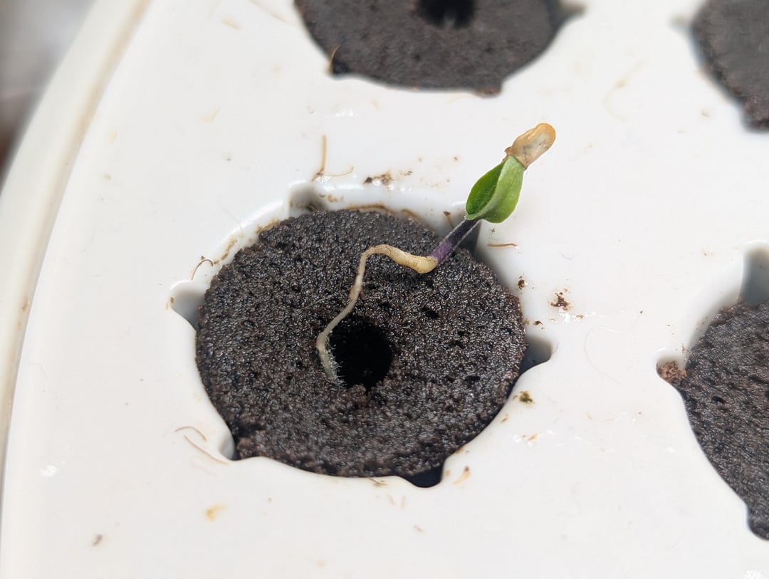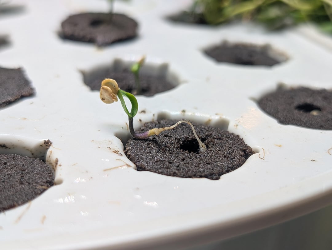 Starting some seeds in my Aerogarden, but this Aji Limo seedling is trying to make a run for it. I'm not quite sure how to go about fixing it. It's been slowly crawling out for the last 2-3 days.