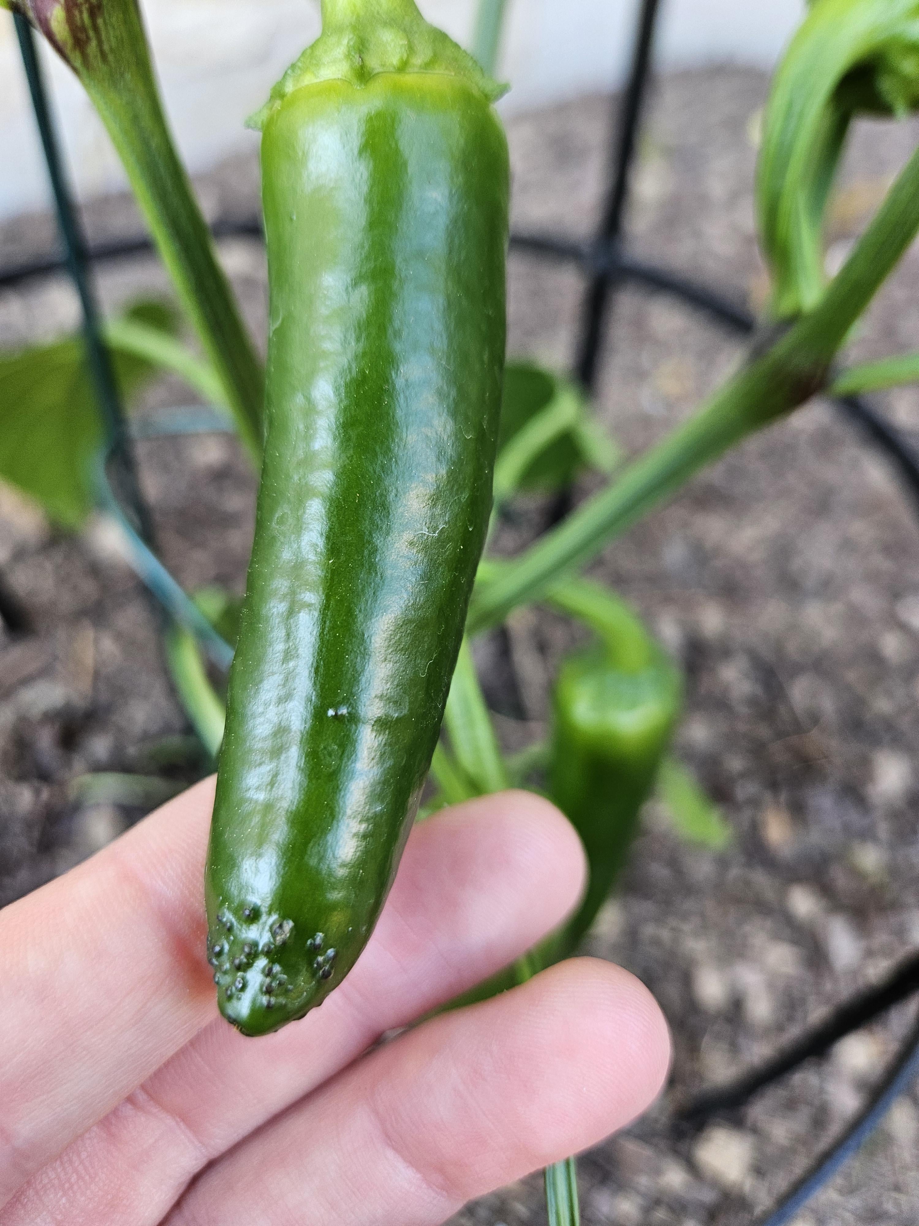 Jalapeno plant, other peppers are nice and smooth and ripening up, but this one specific pepper has these little black bumps on the end. Is this harmless or is this one going/gone bad?by heleghir Hot peppersPeppersSpicy Stuffsweet peppers 1 Comment Hidden_luck 1 hour ago Starting to rotWrite A CommentYou must be logged in to post a comment.