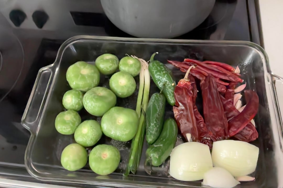 7 tomatillos, half white onion, 5 cloves garlic, 2 green onions, 3 jalapeÃąos,