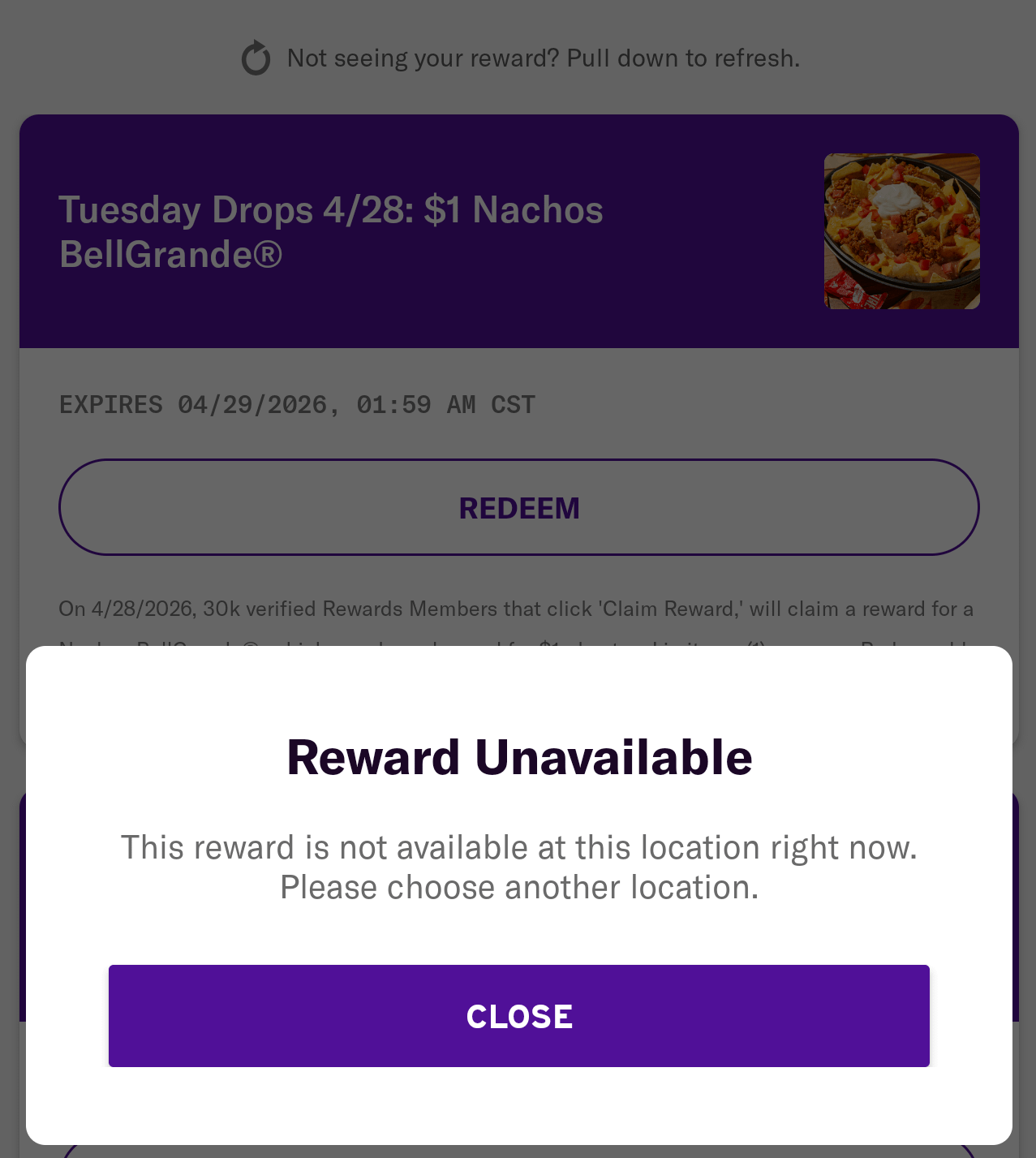 Got my reward, but apparently every single location within a 5 miles radius of me is apparently not participating anymore. First time this has ever happened in my history of getting these Tuesday drops, is taco bell making franchisees eat the cost of these promotions?