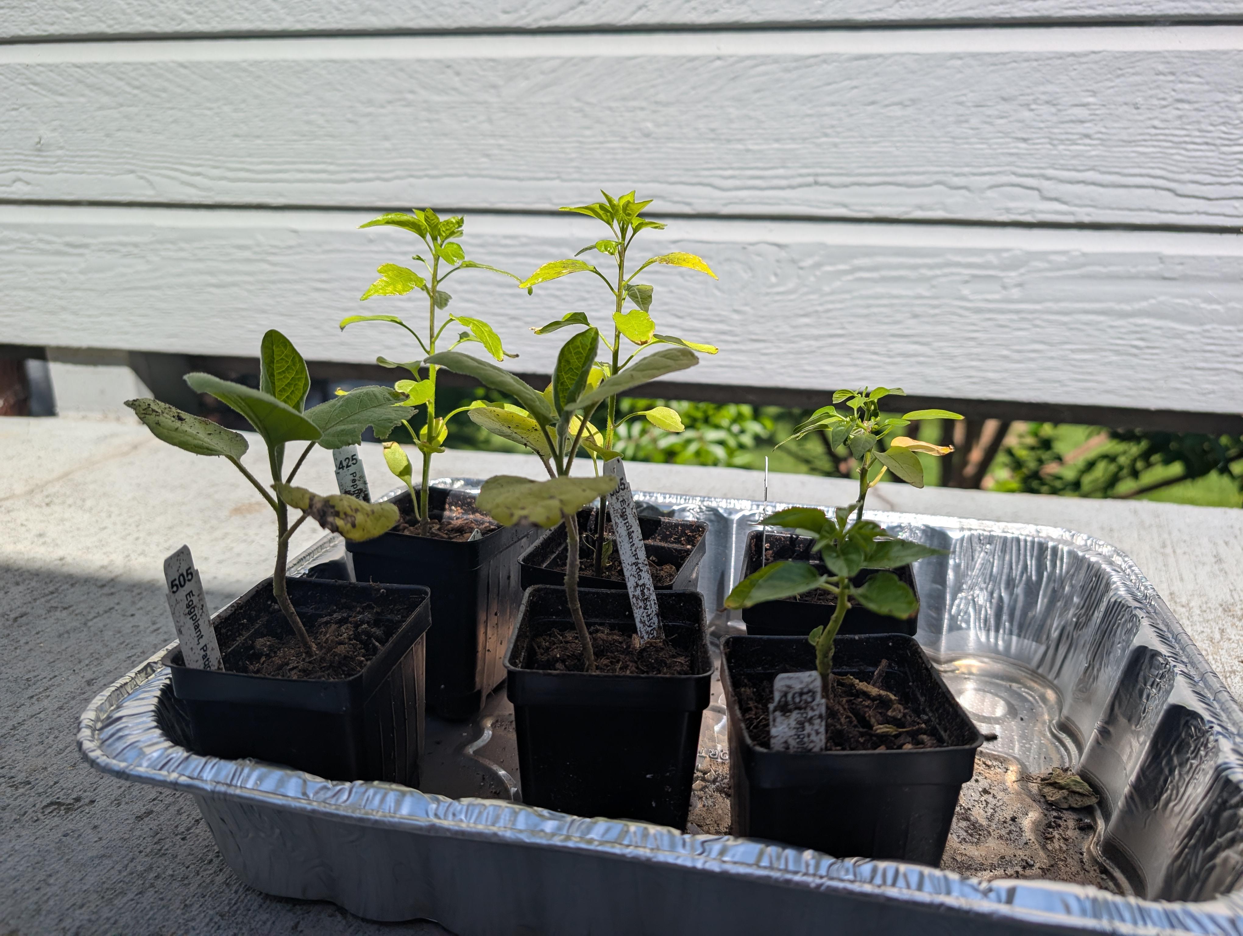 I bought some burpee plants and they arrived a month ago. I put them under grow lights for 12hours a day. I'm worried they are looking leggy now. Due to on and off rainy weather and the night time temp being below 50F, they've been staying indoors for majority of this past month. Today was a nice day so I did place under the sun for an hour and then in the shade now. From the back, left to right are eggplant, eggplant, pepper, shishito, shishito, pepper.