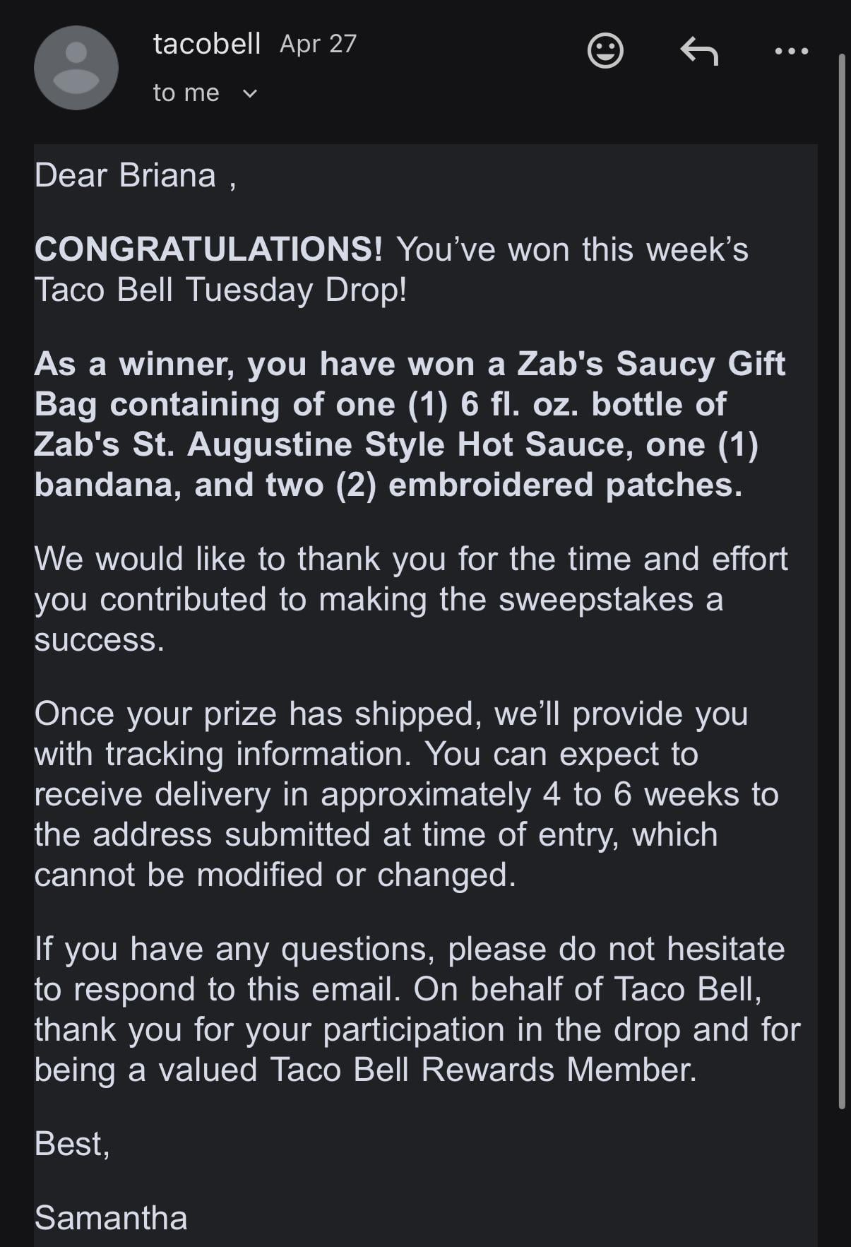 I finally won the Tuesday giveaway drop after trying for months. I have seen some pretty cool prizes like guitars and vinyls and free food for a year so it was definitely disappointing to just win a bottle of hot sauce and a bandanna but hey! What’s the worst drop you’ve seen? I’m still excited lolll
