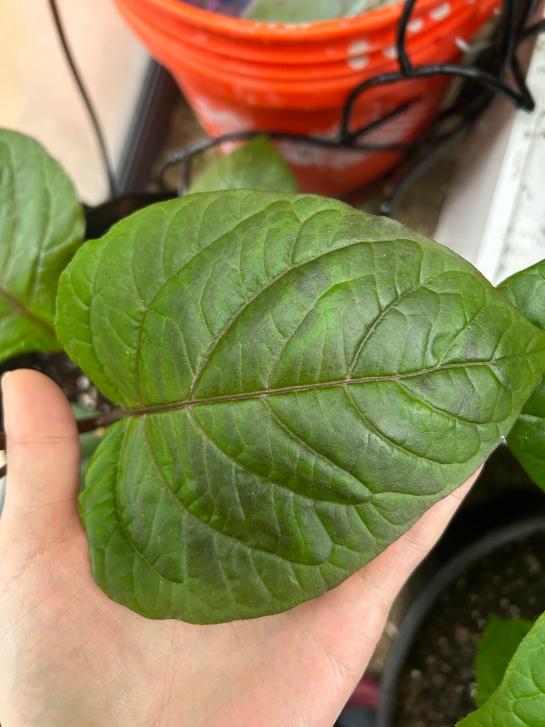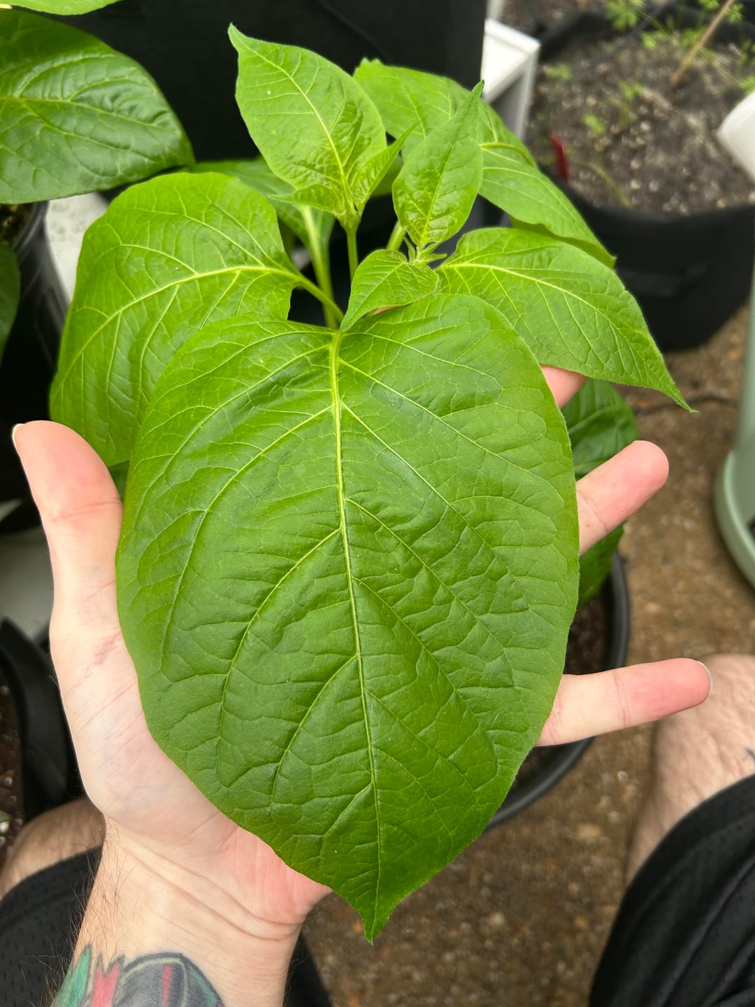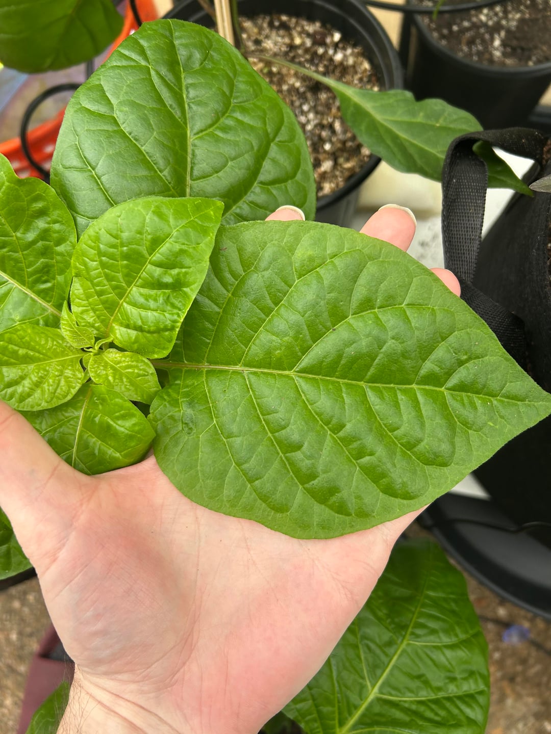 Pink Tiger, Goat Brains, and one of the gigantic leaves from my Sugar Rush Stripey.