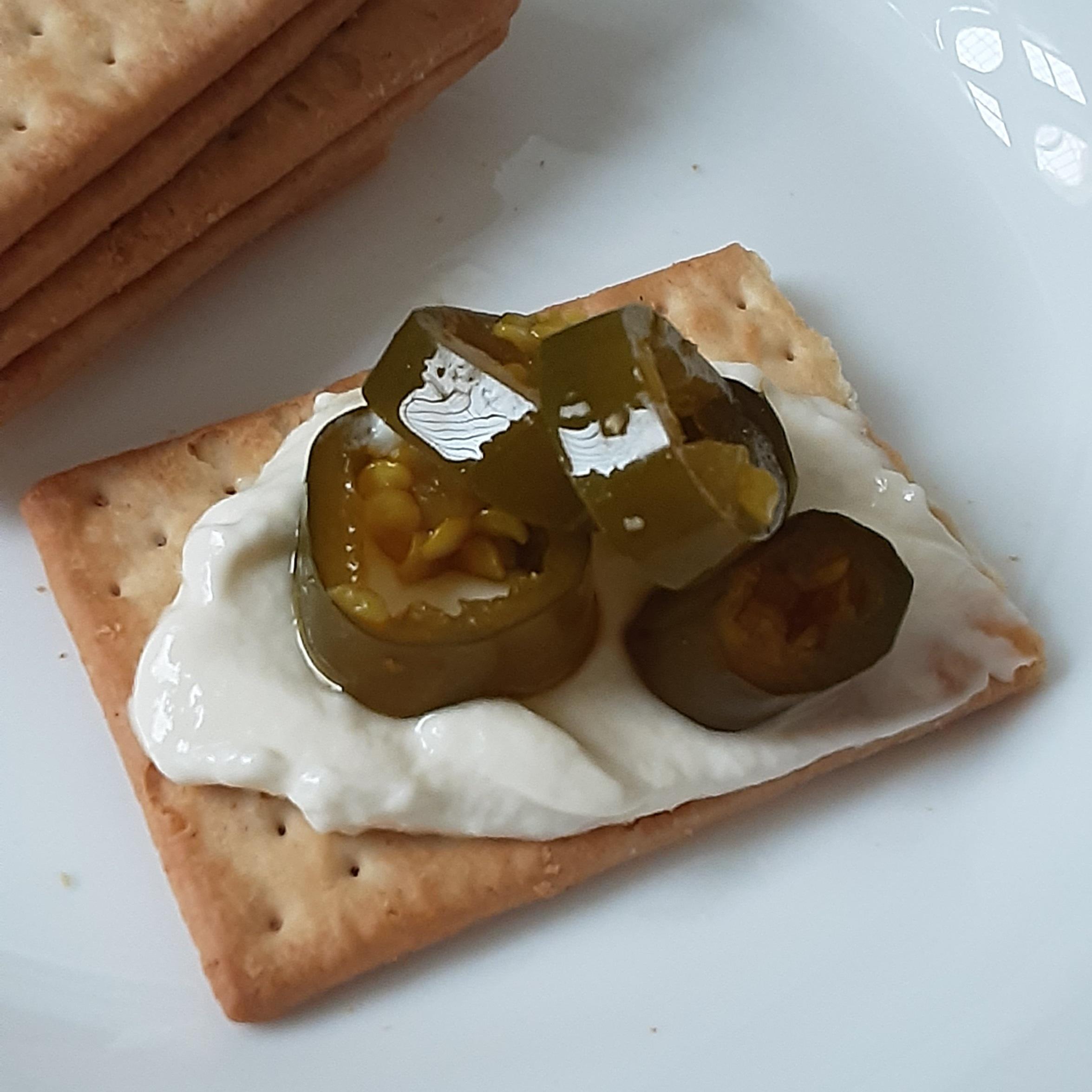 Cowboy Candy on ricotta and a cracker, perfect lazy Saturday snack. Chilichili foodChili RecipesRecipeRedditReddit SpicySpicyspicy foodspicy recipes