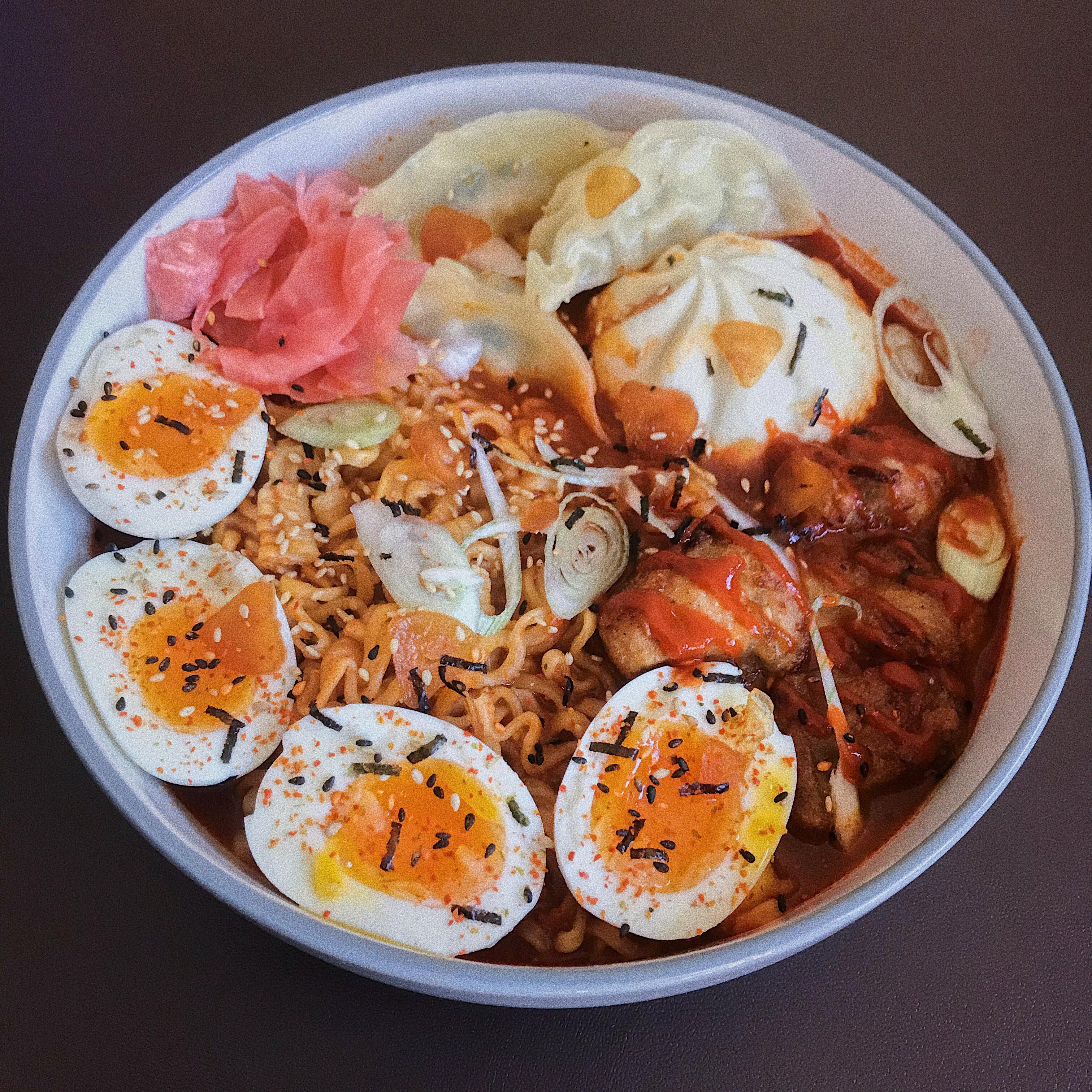 The usual. 2x spicy ramen, gyozas, boa bun, soft boiled eggs, spicy sriracha chicken, + extra samyang hot sauce in a miso-gochu broth Chilichili foodChili RecipesRecipeRedditReddit SpicySpicyspicy foodspicy recipes