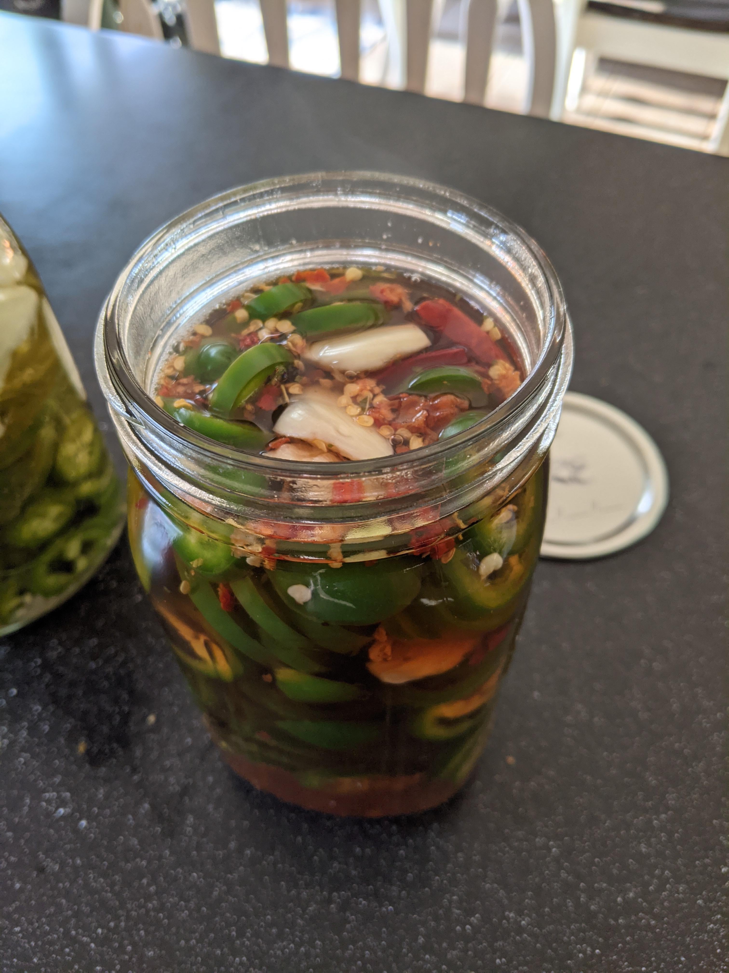 Pickled some jalapeno in red wine vinegar today; threw in dried arbols, cayennes, ghosts, and scorpions just to see what happens. I cannot WAIT to trick my nephew into eating one.
