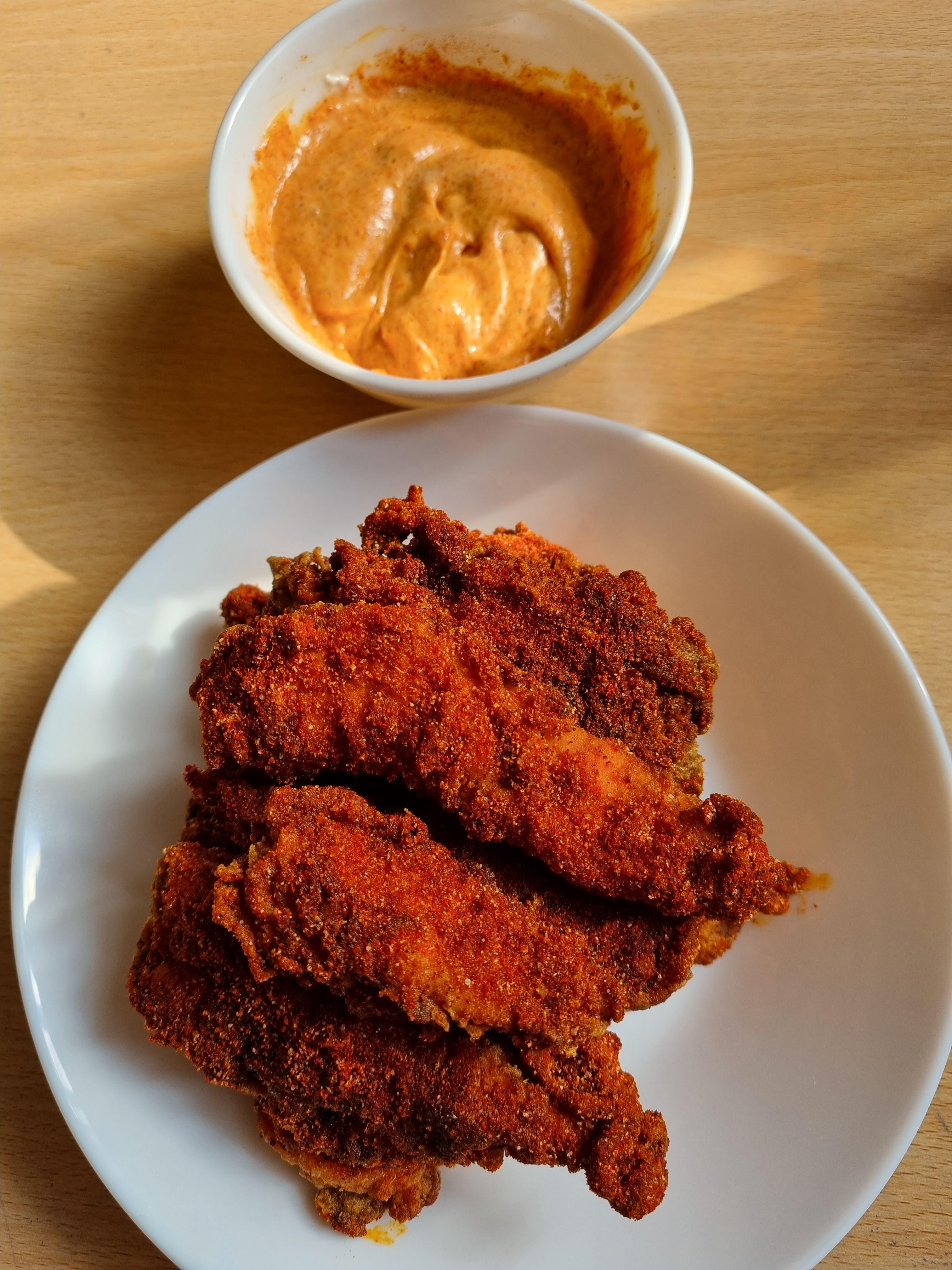 Homemade nashville hot chicken, with some spicy mayo