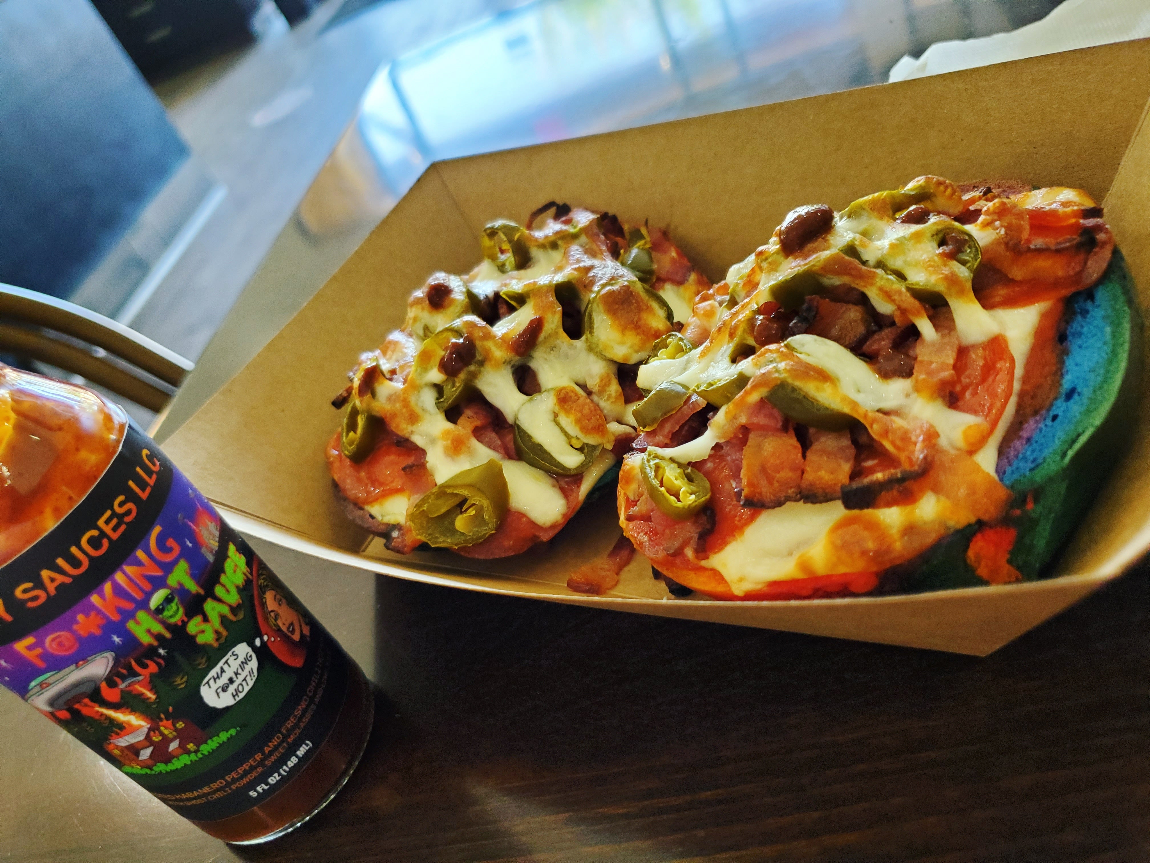 Pepperoni bagel pizza with bacon, peppers and hotsauce