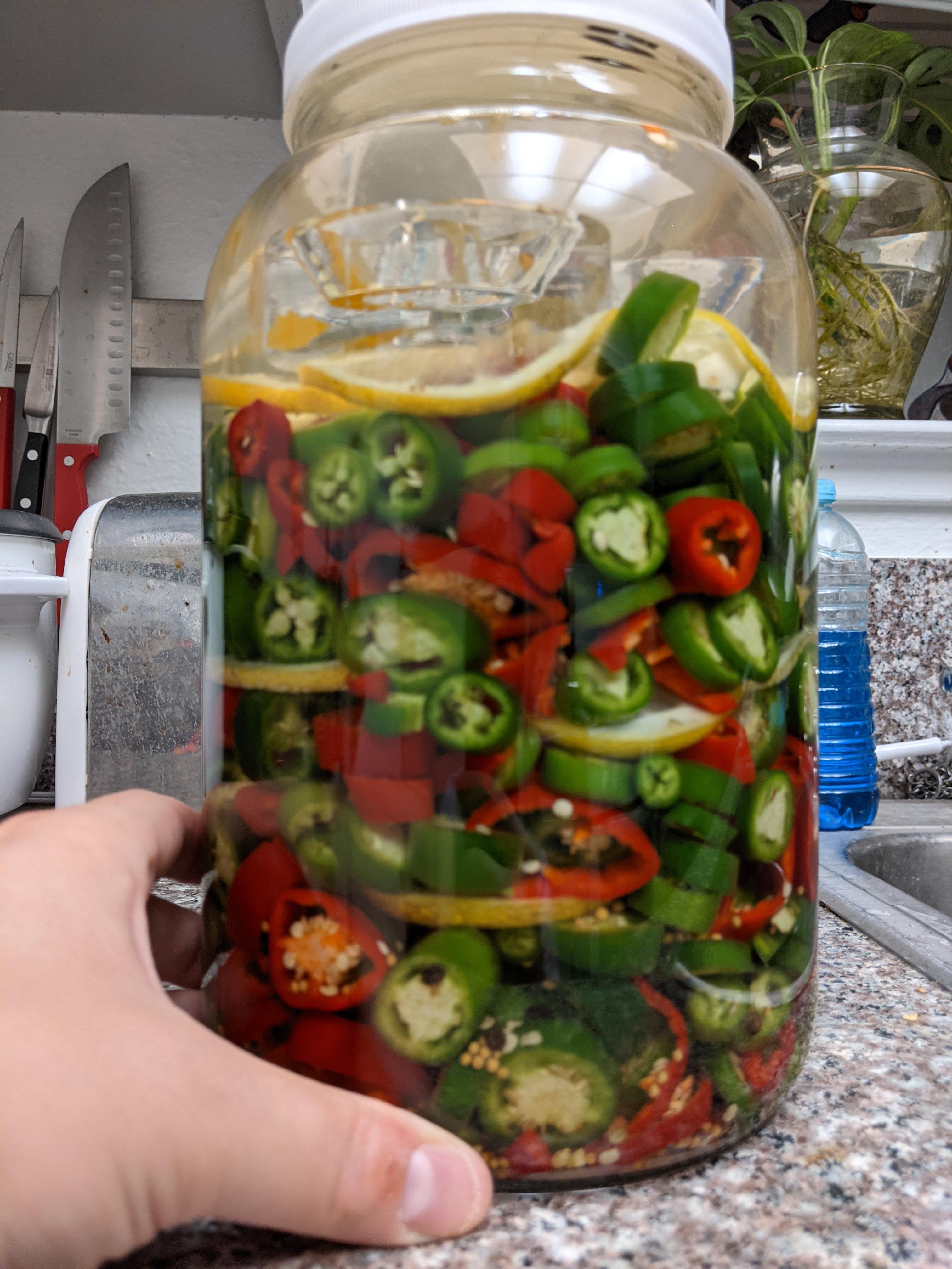 1 gallon of lacto fermented serrano and Fresno. I can’t wait to throw these on burgers this summer.