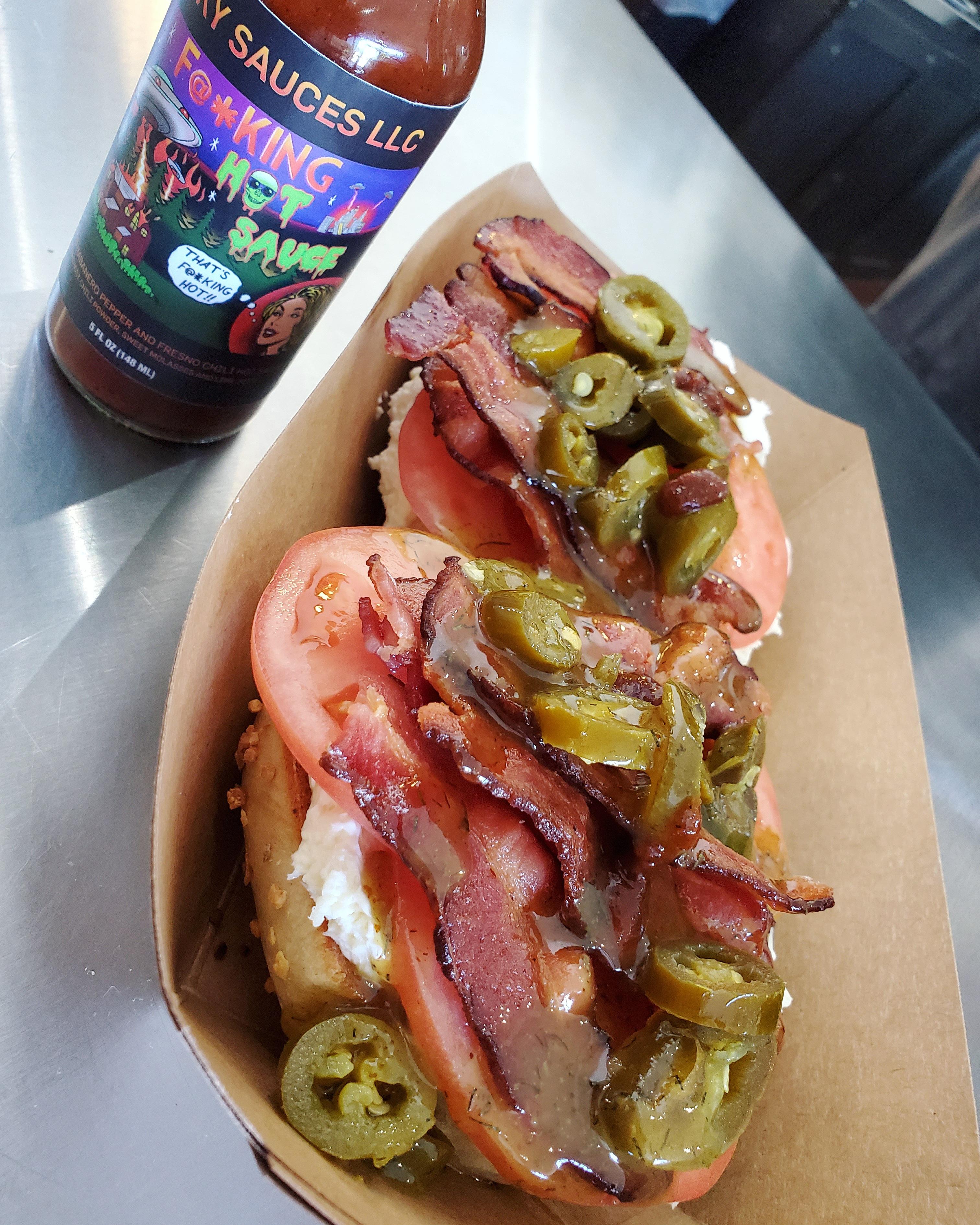 Bagel with cream cheese, peppers, bacon, tomato and hotsauce