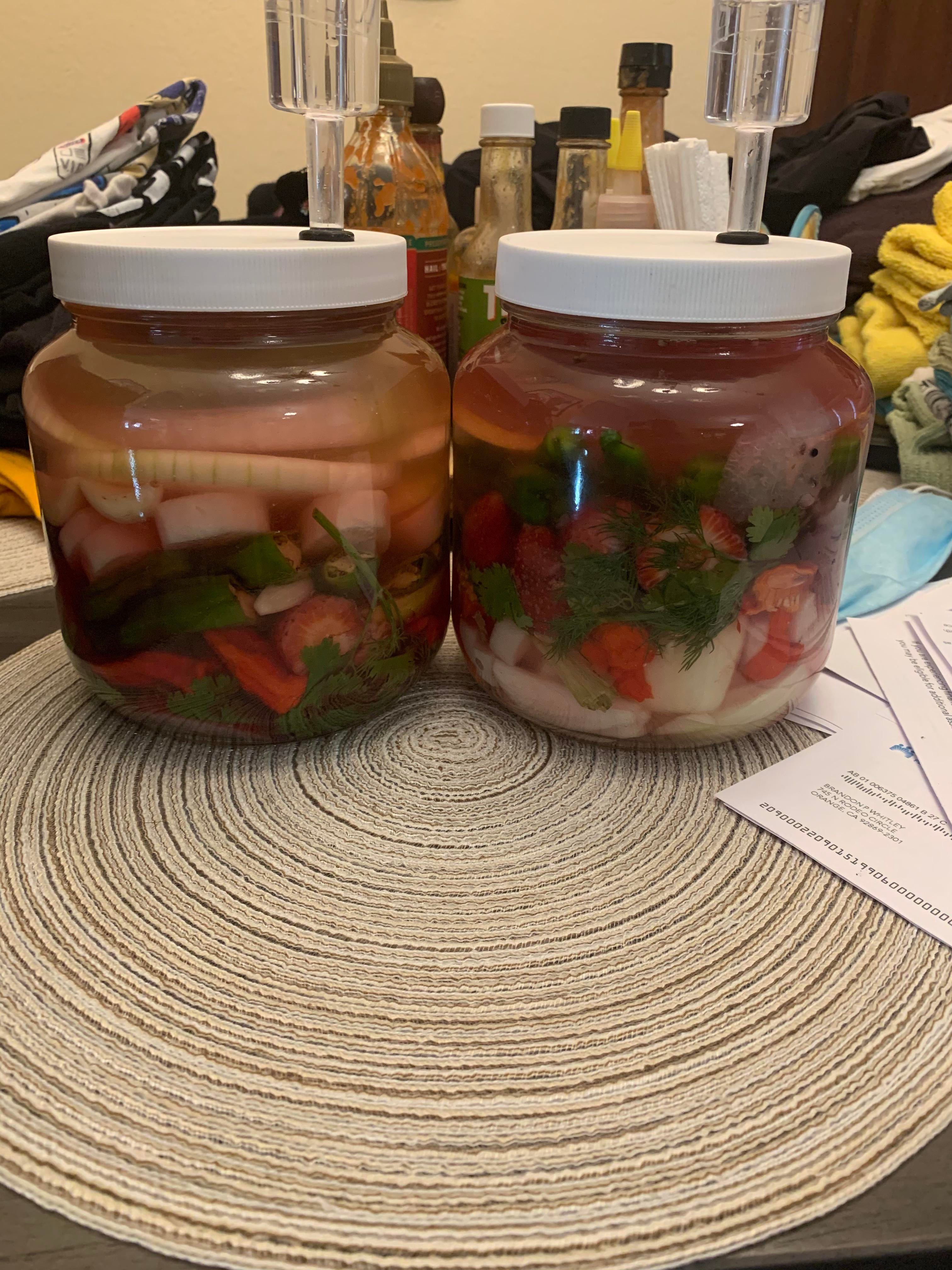New experiment in the works. It’s a long list so here we go. Sweet Maui onion. Asian pear. Strawberries. Yellow dragon fruit. Daikon radish. Shishito peppers. Reapers. Ghosts. Cilantro. Dill. Beets. Garlic. Last but not least a sprig of lemon grass per jar(which will be removed before blending)