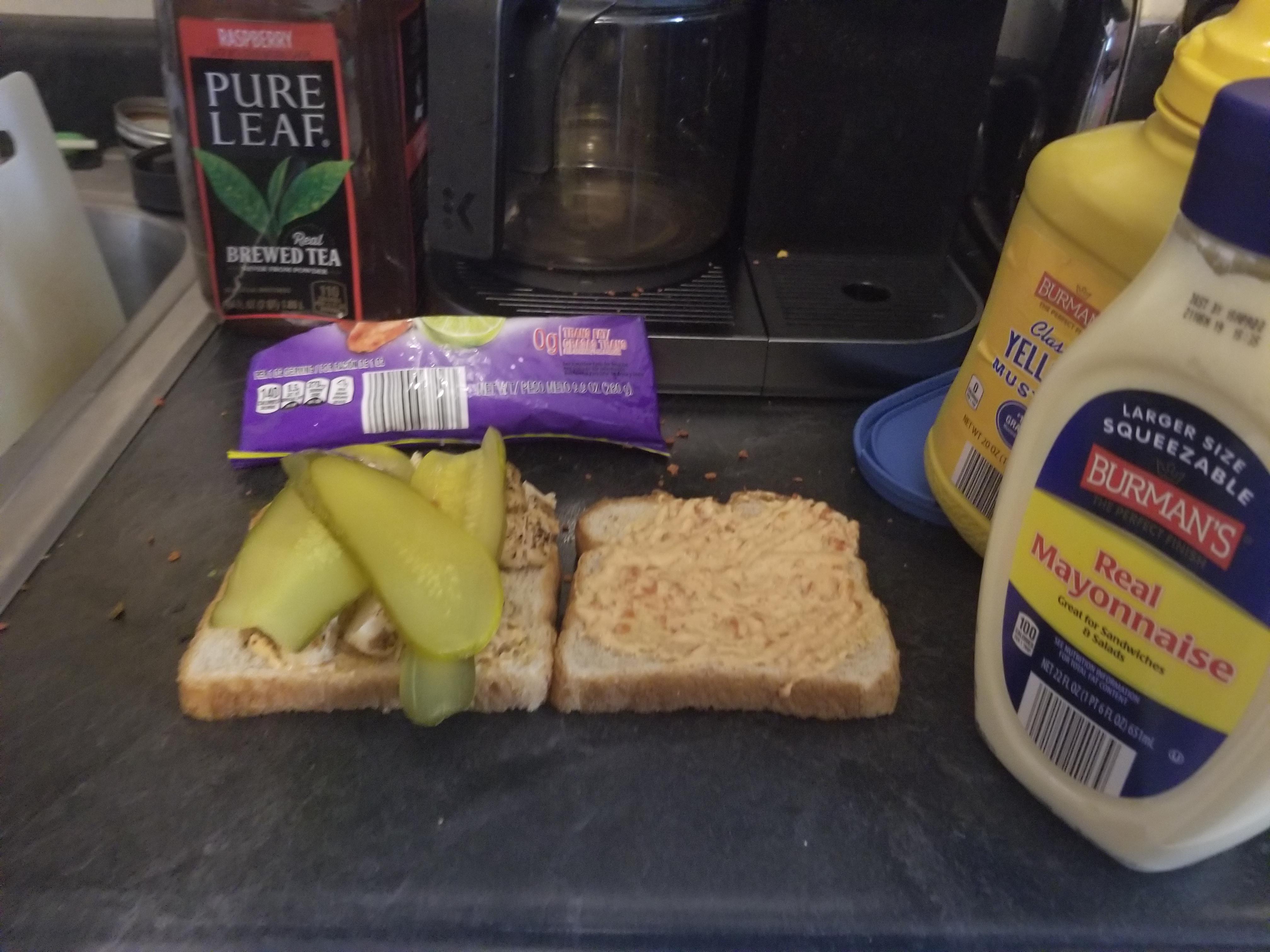 This is the best sandwich the sauce is crushed up takis,mayo and mustard and 3 pickles and sliced chicken