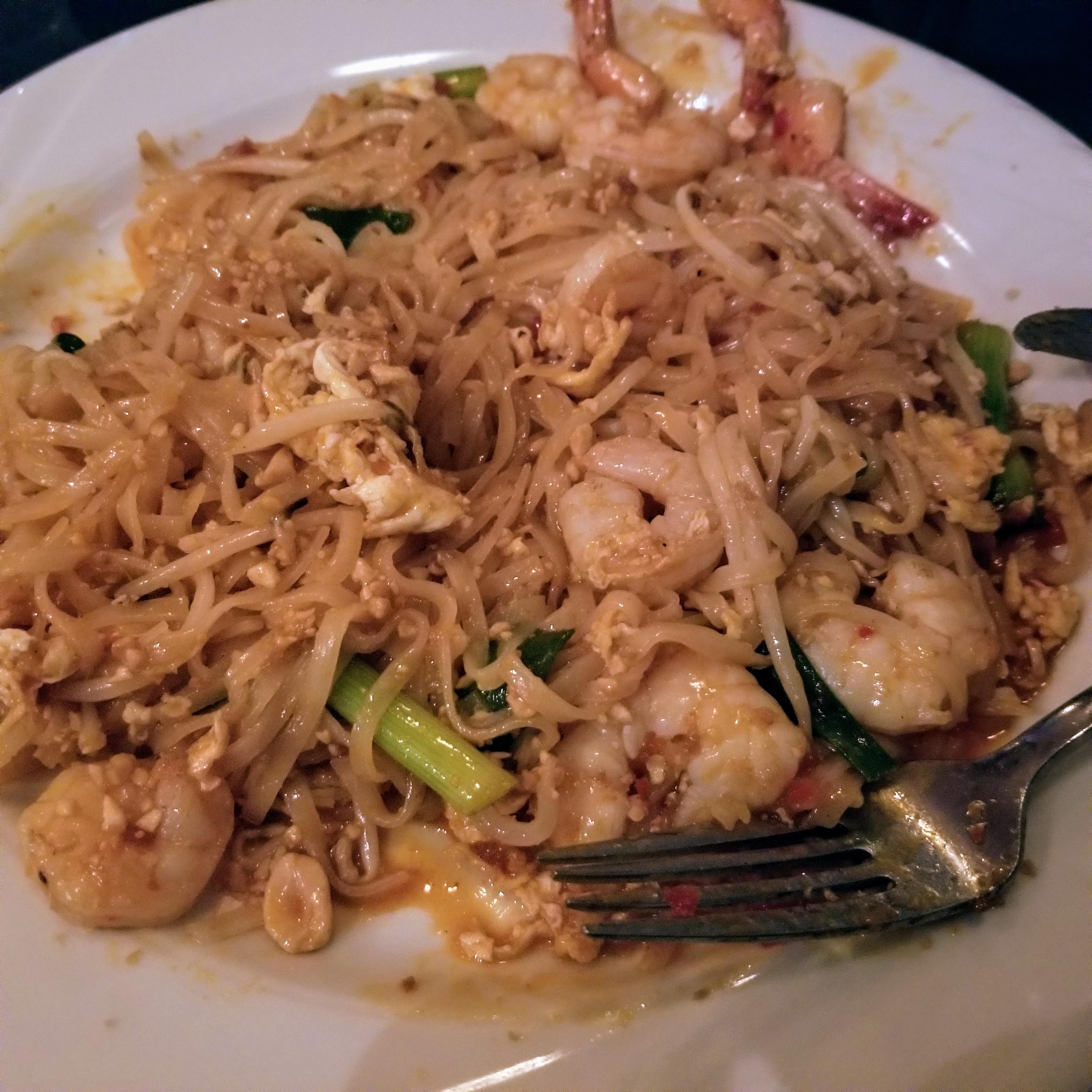 The local Thai restaurant offers spice levels of mild, medium, medium-hot, and hot. But there’s the off-the-menu “Thai Hot” that is phenomenal! Here’s my shrimp Pad Thai, Thai Hot, with a little extra garlic chili sauce mixed in.