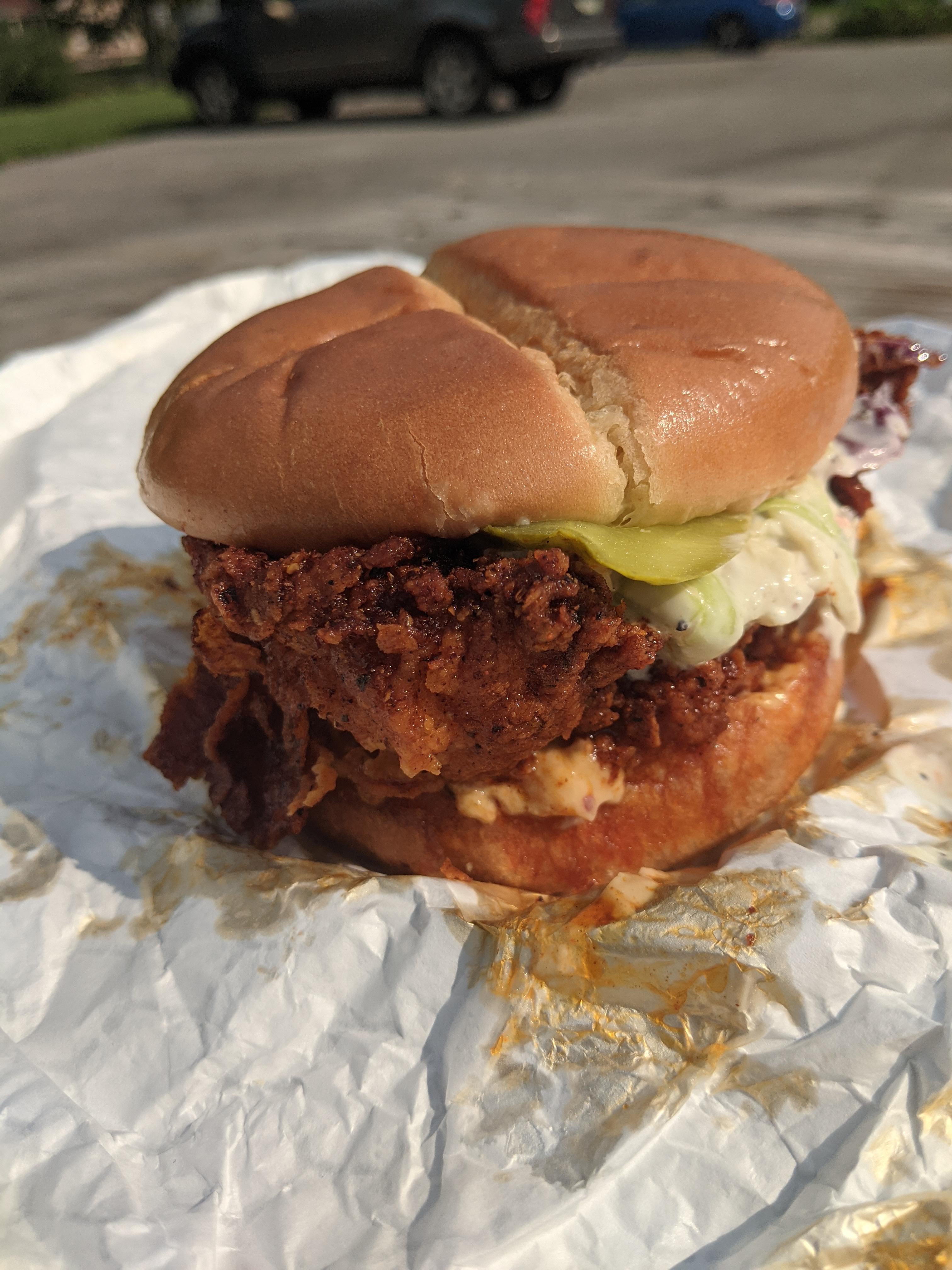 Nashville hot chicken in a reaper sauce, served out of the food truck “Chicken Heat” in Des Moines. Tasty, but definitely started coughing just from breathing it in.