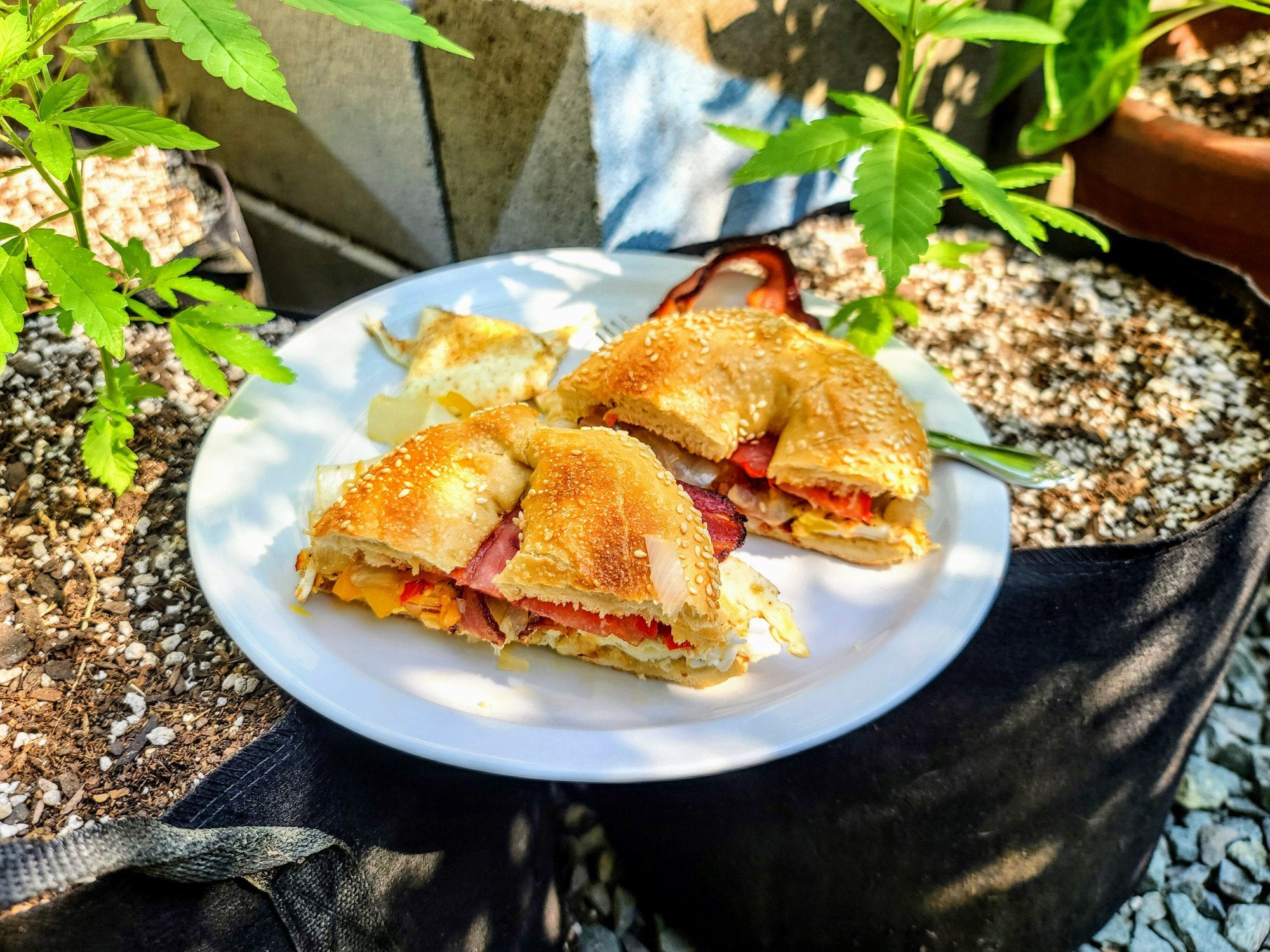 Breakfast bagel with sweet and spicy bacon, over easy egg, home-grown heirloom tomatoes, and sauteed onions with habaneros and scotch bonnets. Chilichili foodChili RecipesRecipeRedditReddit SpicySpicyspicy foodspicy recipes