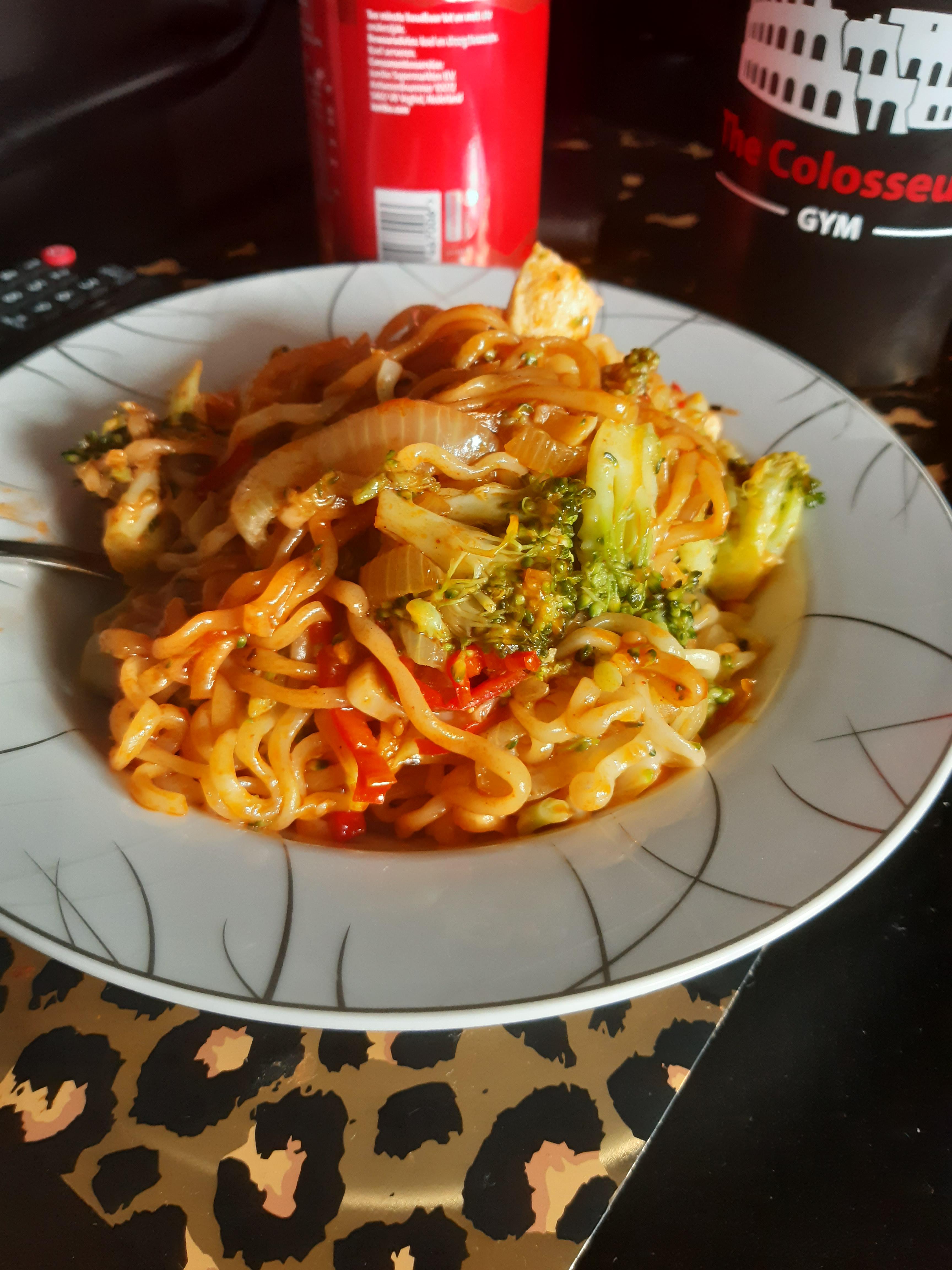 Samyang buldak with brocoli chicken garlic peppers and hella onion.