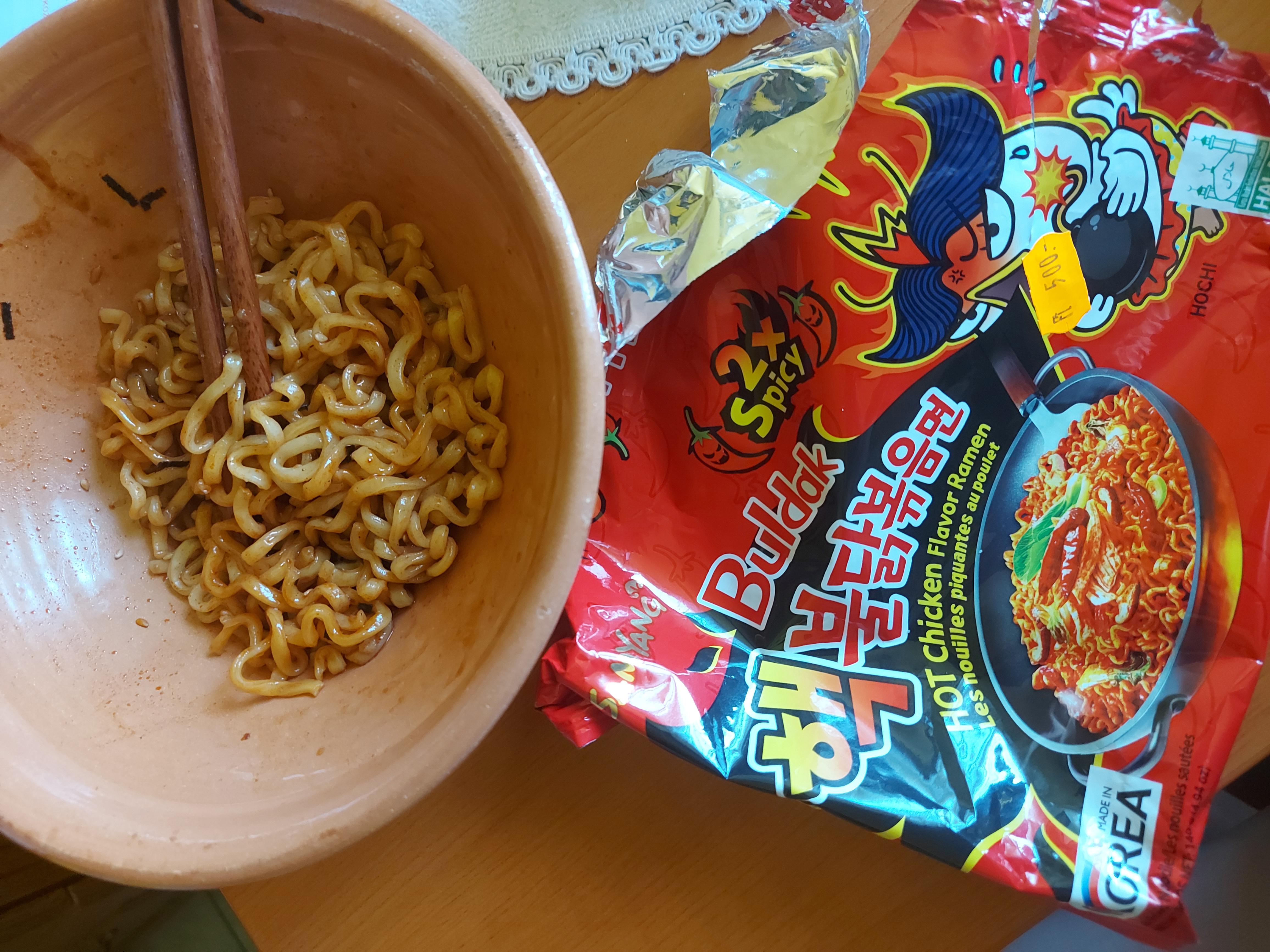 This was my first spicy noodle ever, I really loved it. Nice taste, nice heat for me. Also I’m hoping my gluten intolerance will be friend with the spice (on the toilet if you know what I mean).