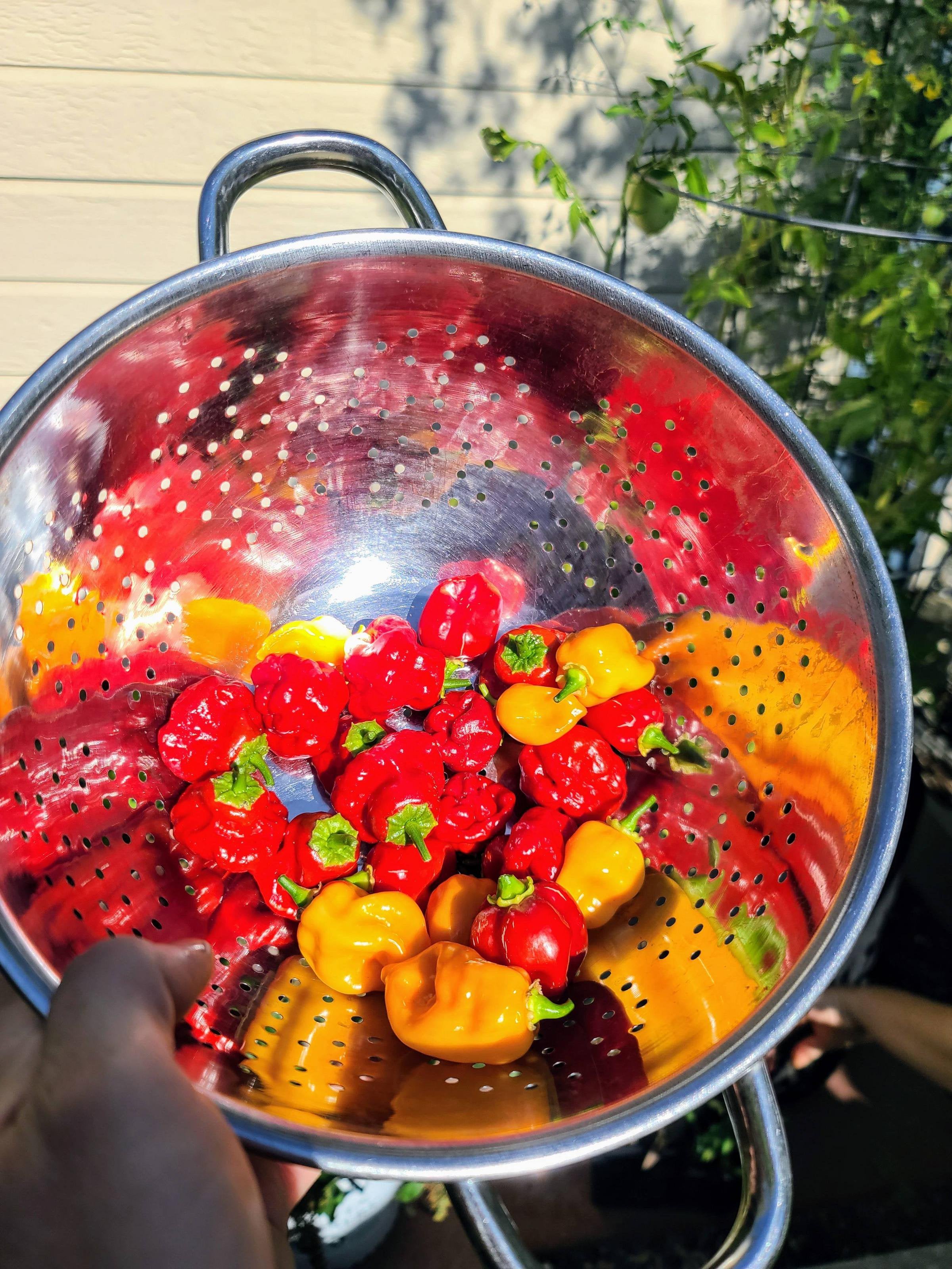 Today’s harvest of Scotch Bonnets, Habaneros, and Caribbean Reds–gifts for the hosts of the Labor Day BBQ. Love giving them away almost as much as eating them.