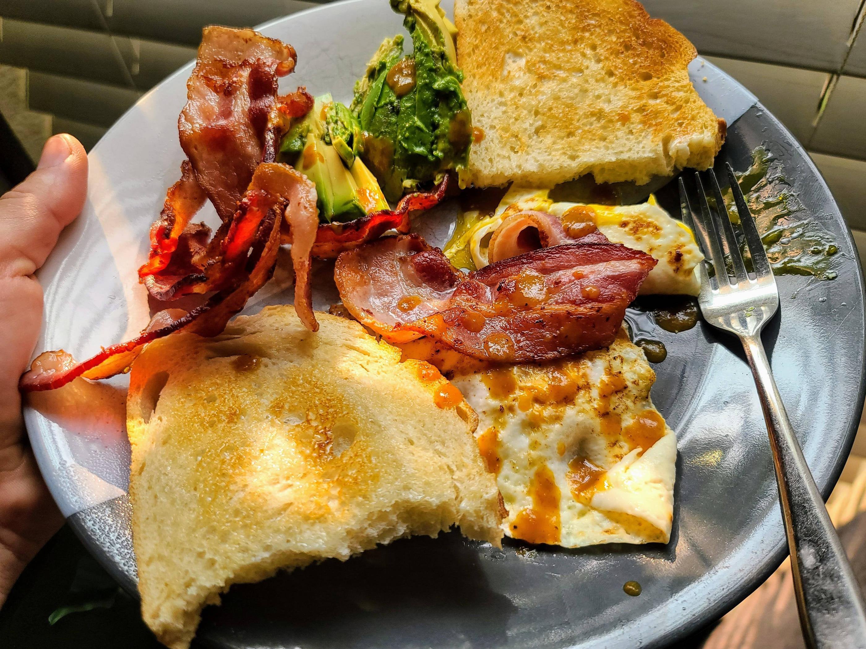 Just a big mess of bacon, over easy eggs, sourdough toast, and avocado, lovingly embraced by El Yucateco Caribbean hot sauce. Chilichili foodChili RecipesRecipeRedditReddit SpicySpicyspicy foodspicy recipes