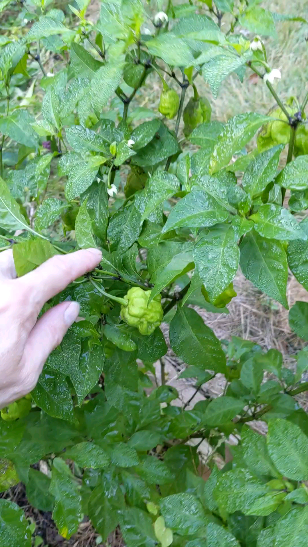 My Carolina Reaper bush, hand for scale