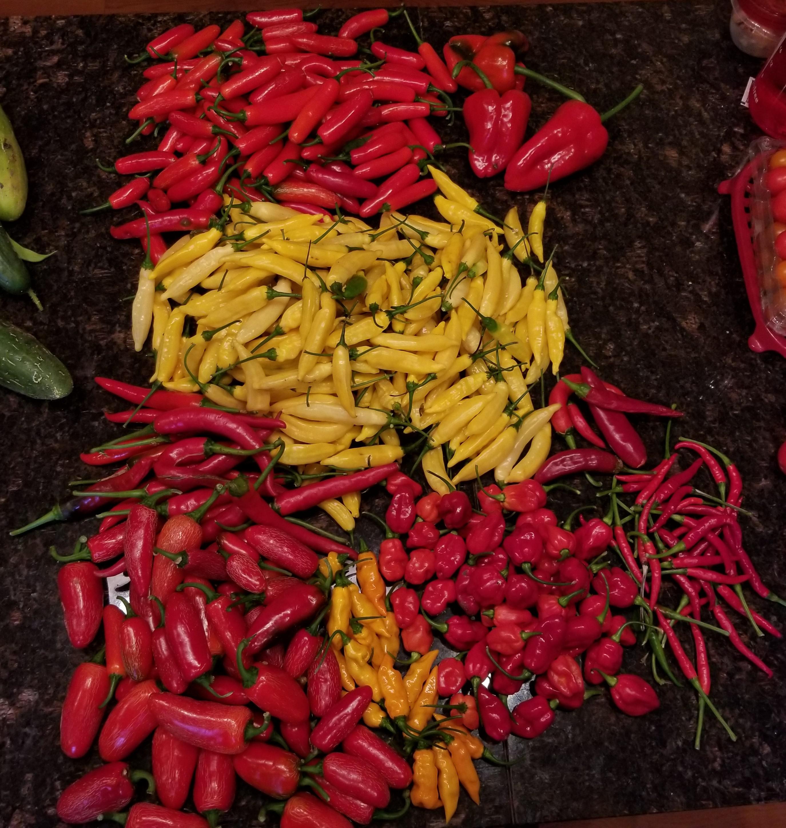 Hot pepper season has been wildly productive in my garden. Included: serrano, poblano, hot lemon, berbere, pointsettia, habanero, datil, jalapeno, and Thai chili.
