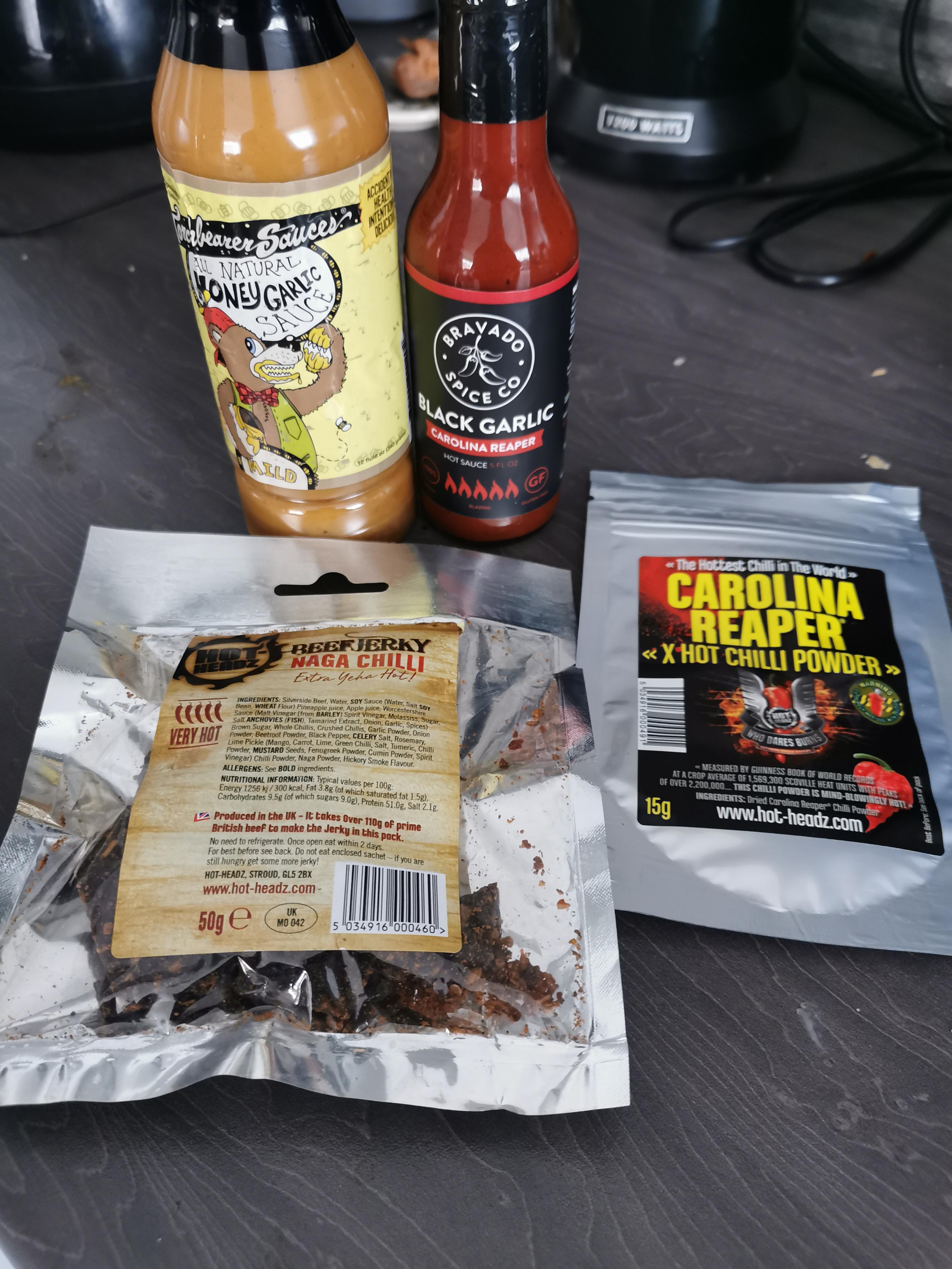my tolerance is improving after years of pain the day after eating hot stuff so I decided to celebrate, the jerky was amazing and the black garlic sauce makes amazing wings!!!