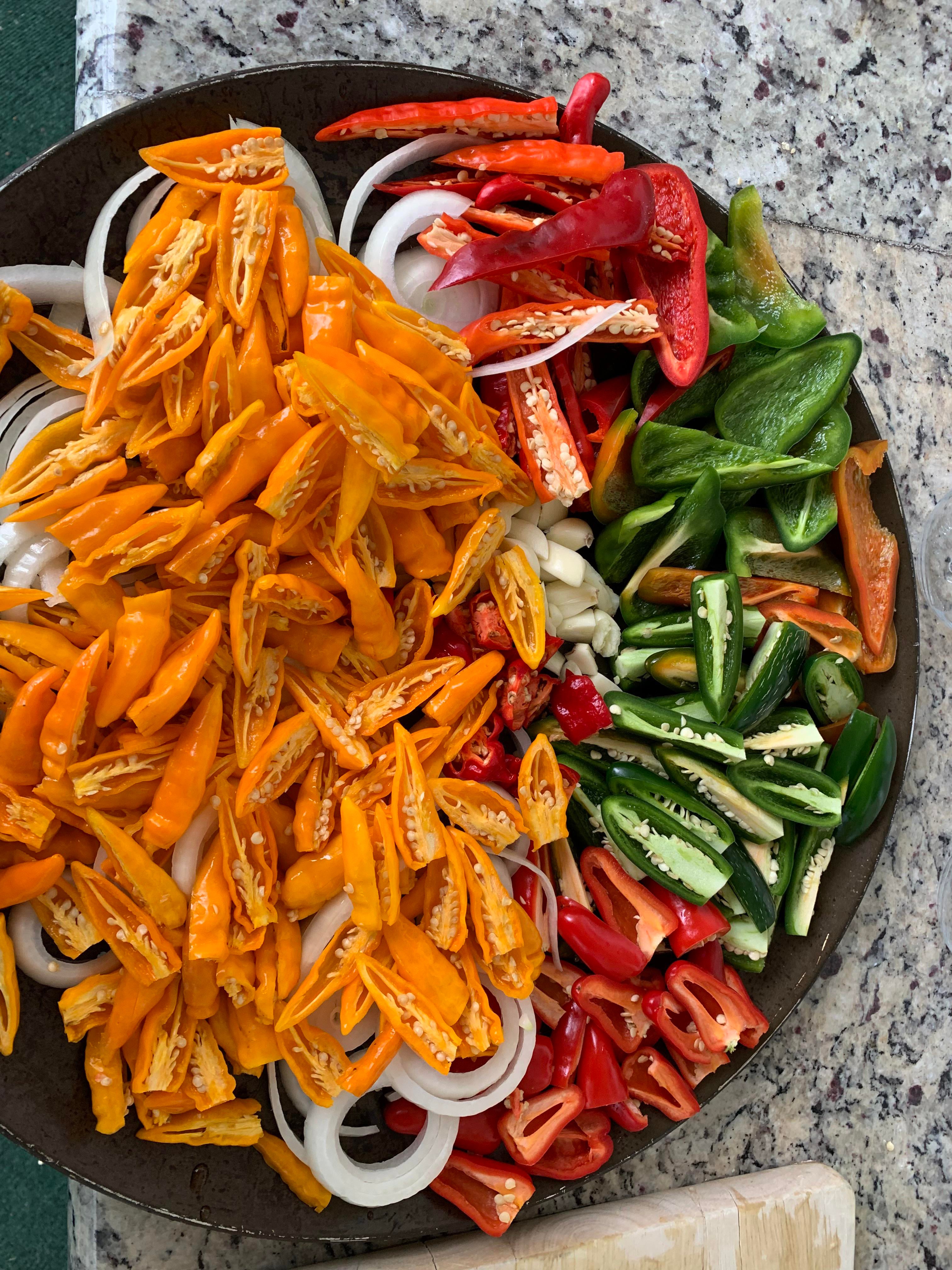 I use a pizza pan with holes in the bottom to smoke a big batch of peppers, then make several small batches with different blends, from mild to scorpion.
